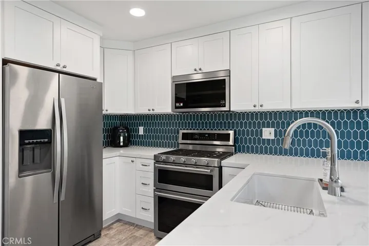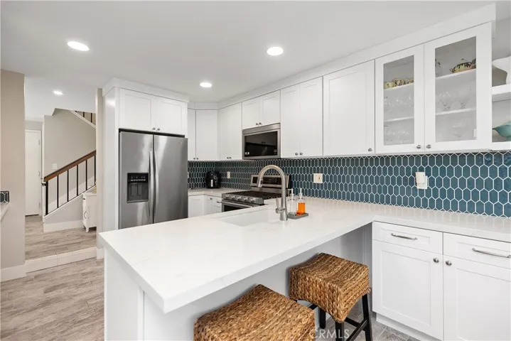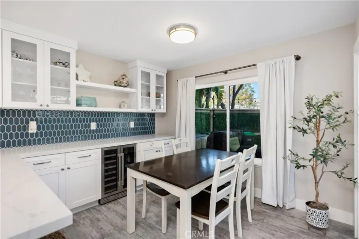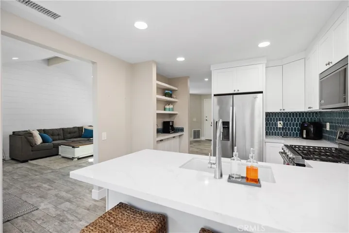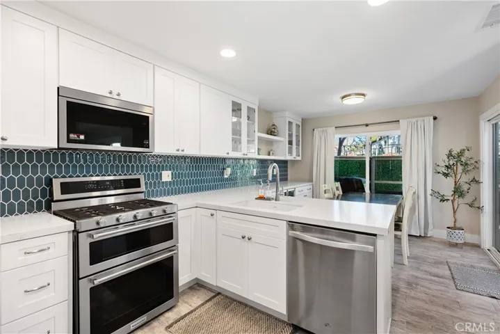Inside, the layout places space exactly where it’s most enjoyed—an open living room area highlighted by soaring vaulted ceilings that enhance natural light and create an airy, spacious feel. The beautifully reimagined kitchen features abundant cabinetry, colorful backsplash, generous counter space, and a functional flow that makes everyday cooking and entertaining effortless. Dual-pane sliding doors from both the kitchen and living room lead to a spacious private patio, creating a seamless indoor–outdoor extension ideal for morning coffee, outdoor dining, or relaxed gatherings.