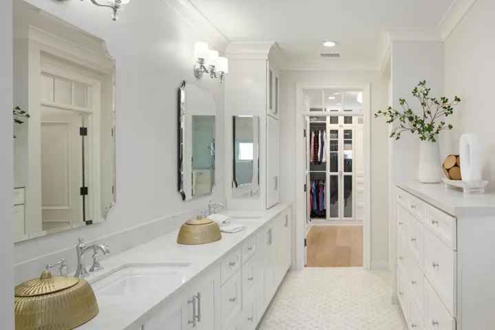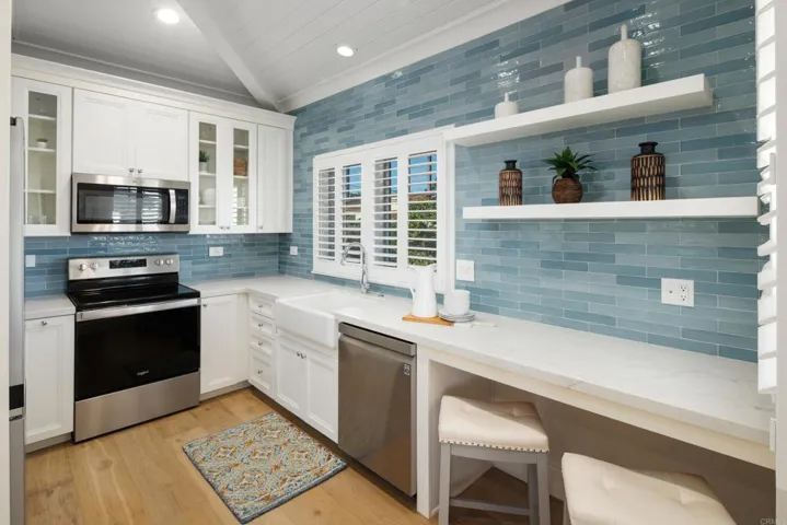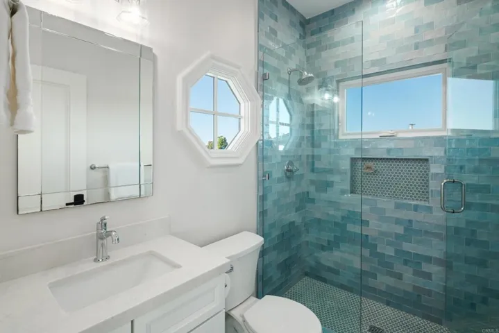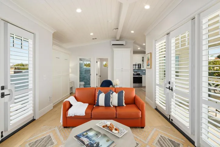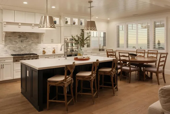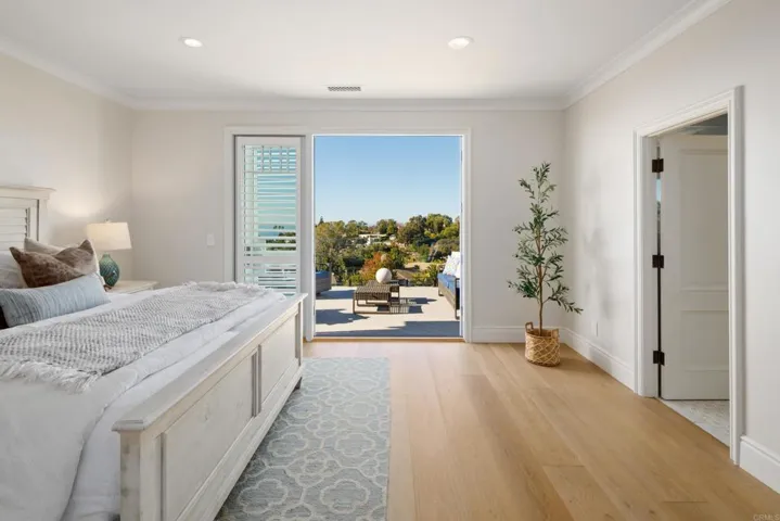 Experience comfort & luxury in this newly remodeled contemporary Hampton-style home featuring 4 bedrooms, 4.5 baths, and an expansive open-concept layout designed for modern living. The main residence is single-level with a spacious great room and well-equipped gourmet kitchen anchored by a large island that flows effortlessly out onto the newly-built TimberTech rear deck. You will enjoy breathtaking panoramic ocean and canyon views from both the great room and the custom pergola-covered deck. High ceilings with transom windows, French doors, and plantation shutters fill the home with natural light. French Oak wood flooring extends throughout, complementing the home’s coastal charm. Generous wall spaces and custom lighting provide ideal areas to display art, adding a refined touch to the interiors. Each spacious bedroom includes built-ins and ensuite bathrooms featuring custom tilework and natural stone finishes for timeless elegance. Upstairs is a generous ADU that offers a full-size kitchen, bath, and walk-in closet—perfect for guests, extended family, or rental income potential. The ADU has a separate entrance for privacy as well, and amazing views to both the north and south. This home beautifully blends comfortable luxury and modern sophistication, accentuating La Jolla’s desirable lifestyle with impeccable craftsmanship and unforgettable views.