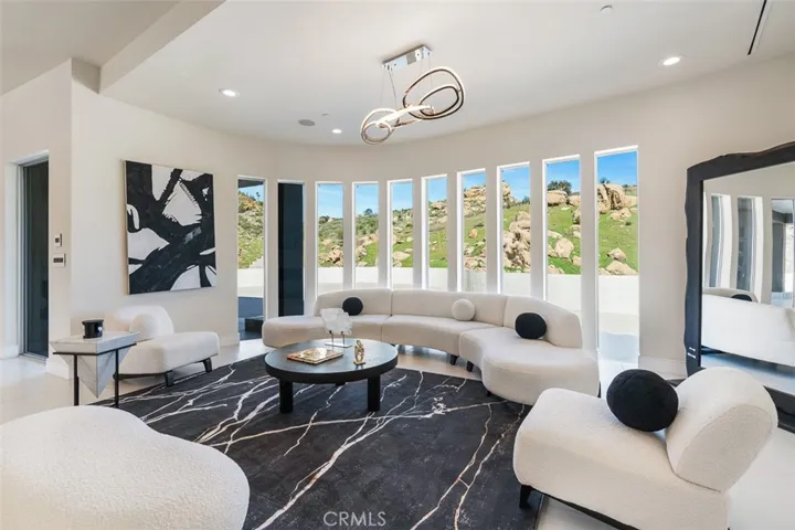 Discover the pinnacle of luxury living in this 2020-built, single-story modern estate, situated on over 31 private acres in the prestigious guard-gated community of Bell Canyon. Accessed via a triple-gated entry and a quarter-mile private driveway, this architectural masterpiece offers unobstructed 360-degree mountain vistas, ensuring both serenity and seclusion.