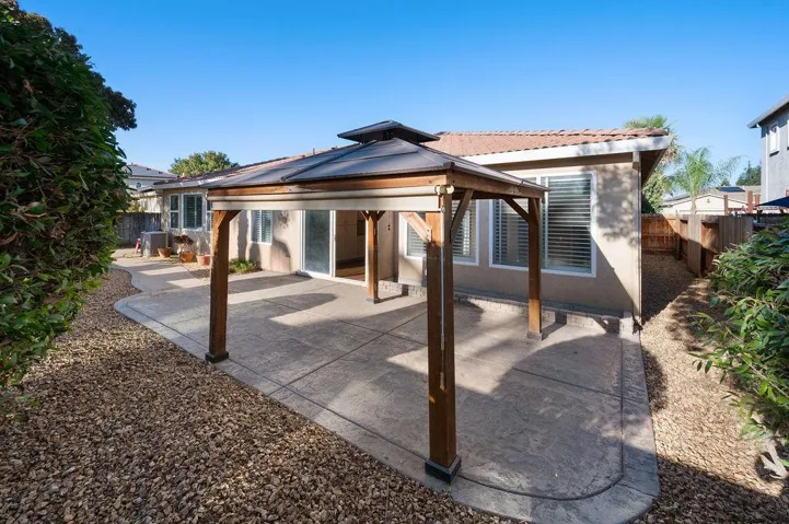 This immaculate 3-bedroom, 2-bathroom home in the desirable Greenhills gated community offers 2,269 sq ft of move-in-ready living space. Built in 2006, the home features a formal living and dining area leading into a spacious great room with a stone fireplace. The open kitchen boasts granite countertops, a center island, a gas range, and a microwave. Luxury wood vinyl flooring and plantation shutters enhance the home’s elegance. Step outside to a private backyard with stamped concrete, cement walkways, and a stunning gazebo – ideal for entertaining. Residents enjoy access to community amenities, including a pool, clubhouse, and more. With a 3-car garage and central A/C, this home combines comfort and style in a sought-after location. Don’t miss out on this exceptional opportunity!