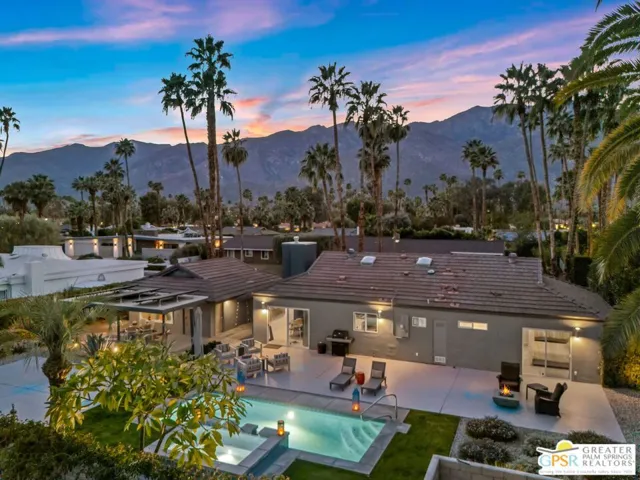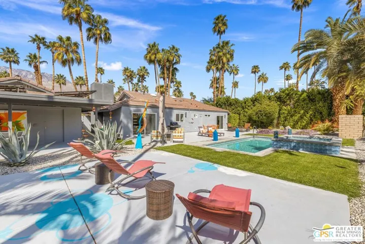 Welcome to this meticulously renovated modern home in one of South Palm Springs’ most sought-after neighborhoods, Los Compadres. Situated on land you own, this home features a comprehensive floor-to-ceiling transformation, delivering high-end finishes and remarkable outdoor living spaces with breathtaking mountain views to the East, South, and West. It truly shows like a model! Step inside to discover an airy, open-concept floor plan bathed in natural light. The home boasts sleek modern cabinetry, Cambria quartz countertops, and terrazzo tile flooring throughout. The resort-style backyard is an entertainer’s dream, featuring a sparkling pool, a separate in-ground spa, multiple outdoor living and dining areas, lush landscaping, and panoramic, wire-free mountain views. Additional highlights include brand-new dual-pane windows with custom window treatments (installed in 2022), updated electrical wiring and plumbing, as well as new interior and exterior doors. The home also features a newly installed HVAC system and paid-off solar panels for energy efficiency. There’s no HOA, and the property qualifies for a Vacation Rental Certificate, making it an excellent opportunity for short-term rentals! The chef-inspired kitchen seamlessly opens to the living and dining areas, both of which offer sweeping views and easy access to the outdoor space. The backyard is beautifully framed by colorful, low-maintenance landscaping, creating a serene environment for relaxation. The primary ensuite retreat offers stunning views, direct access to the private backyard, and a spa-inspired bathroom with modern cabinetry, Cambria quartz countertops, dual sinks, and a large walk-in shower with a clerestory window, frameless glass, and dual showerheads. The two west-facing guest bedrooms are equally impressive, with mountain views, terrazzo tile flooring, and convenient access to the beautifully appointed hallway bathroom, featuring modern cabinetry, Cambria quartz countertops, dual sinks, and a shower/tub combination with dual showerheads. Additional features include an indoor laundry area, making this home as practical as it is stylish.