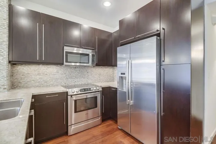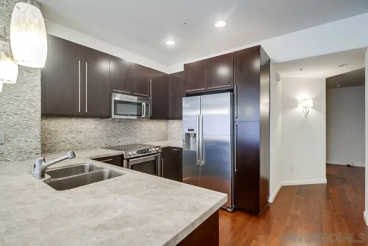 Experience urban living at its finest in this east-facing 5th-floor residence at Crown Bay, one of Downtown San Diego’s most desirable communities. The unit offers 2-bedrooms, 2-baths with a private balcony and stunning views. The thoughtfully renovated interior features upgraded wood flooring, stainless steel appliances, elegant stone backsplashes, beautiful lighting, built-ins, and stylish tile finishes. The spacious floor plan offers a well-designed kitchen with ample cabinetry and countertops – perfect for cooking and entertaining. The primary bedroom suite provides a relaxing retreat with designer window treatments, a fully outfitted walk-in closet, dual vanity, and step-in shower. The unit also has its own washer and dryer. Crown Bay residents enjoy premium amenities including a fitness center, beautifully landscaped courtyard, and rooftop BBQ area. It is conveniently located close to the best dining, shopping, entertainment that San Diego has to offer, as well as the Ball Park, San Diego Civic Center, Seaport Village and easy access to the San Diego trolley.