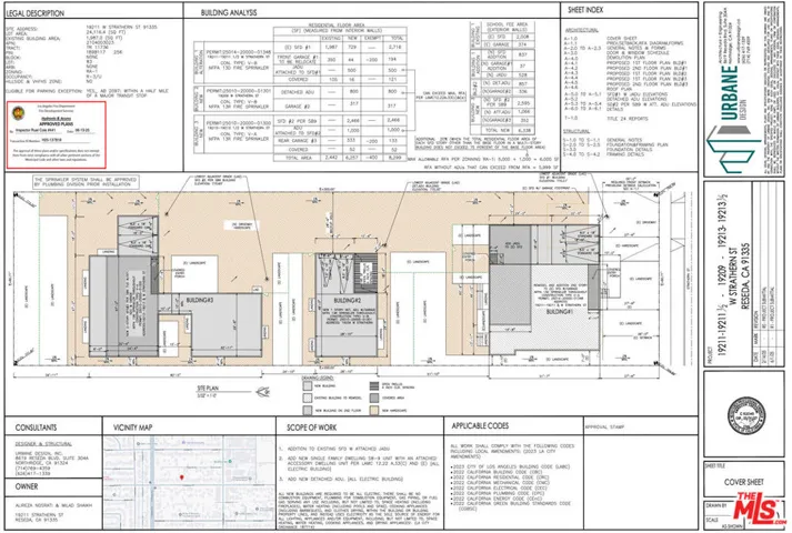 A rare RTI-approved development opportunity in the heart of Reseda, 19211 W Strathern Street offers a fully entitled half-acre lot with plans ready to build a modern multi-residence compound under SB9. Designed by Urbane Design, Inc., the approved plans include Building 1: a remodeled and expanded two-story main home totaling 2,716 square feet with an attached 500-square-foot junior ADU and two-car garage; Building 2: a single-story detached 800-square-foot ADU with its own two-car garage; and Building 3: a newly constructed SB9 two-story residence totaling 2,466 square feet with an attached 1,000-square-foot ADU and two-car garage. Together, the project encompasses approximately 8,299 square feet of all-electric living. Each residence is designed with modern efficiency and architectural harmony, featuring NFPA 13D/13R sprinkler systems and full compliance with Los Angeles’s all-electric ordinance. Zoned RA-1 and eligible for AB 2097 parking exemption within half a mile of a major transit stop, this property offers exceptional flexibility for investors, builders, or end users envisioning a private estate or income-producing multi-unit community. With permits ready to issue and no entitlement delays, this is a rare opportunity to break ground immediately and bring a sophisticated, design-forward project to life on one of Reseda’s largest RTI-approved lots. Approved RTI plans available for review upon request.