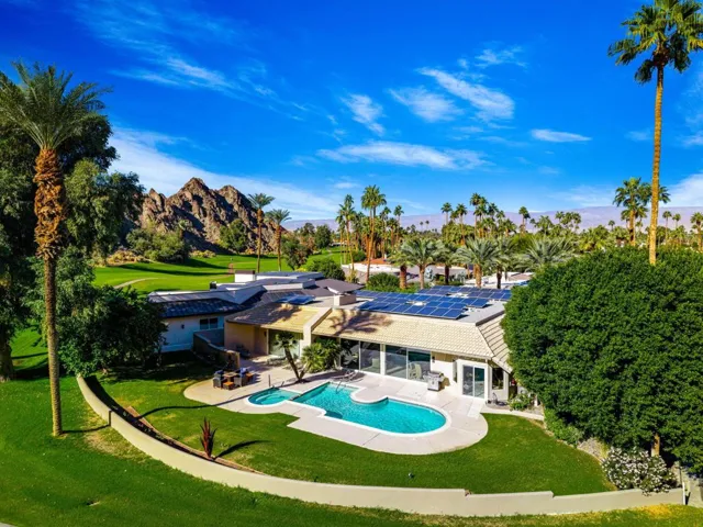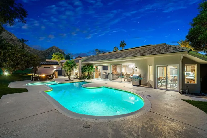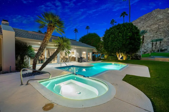 The very best of Indian Wells Living where sophisticated design,, timeless finishes and awe inspiring mountain views come together in perfect harmony. Nestled at the end of a cul-de-sac behind the gates of Indian Wells Country Club , this fully reimagined , remarkable residence is set against the breathtaking backdrop of the mountains dramatically illuminated at night to create an enchanting and unforgettable ambiance. Offering 3 spacious en- suite bedrooms & an extra 1/2 bath for guests, 3417 sqft of open space provide a great room floor plan designed for modern desert living with seamless indoor outdoor flow . Walls of glass frame the panoramic views and open to a resort style backyard featuring a sparkling pool , spa and fire pit.Finishes include chiseled edge travertine floors ,a chef’s gourmet kitchen with premium stainless steal kitchen aid appliances and custom cabinetry. owned solar panels with electric bills of only $160/ month. and a 2 car garage plus golf cart garage- large enough for a small sports car complete this exceptional residence.Buyer to verify all information here in including square footage through their personal and professional inspections.