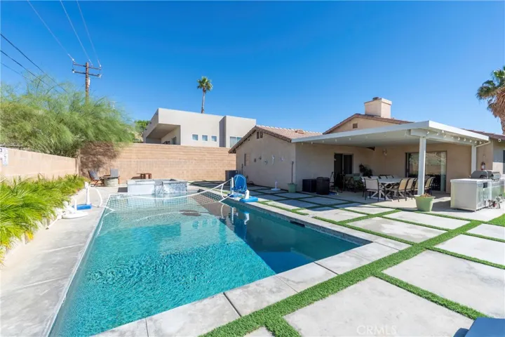 Relax and entertain in your own private backyard oasis, featuring a newly added pool and jacuzzi, a built in gas grill and a patio- perfect for gatherings under the desert sun. Enjoy the best of outdoor and indoor living with stunning desert views and all the upgrades already done for you.