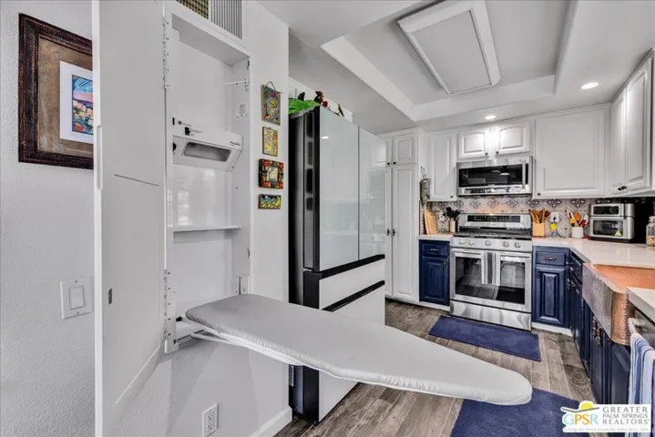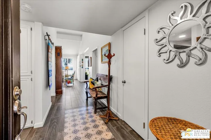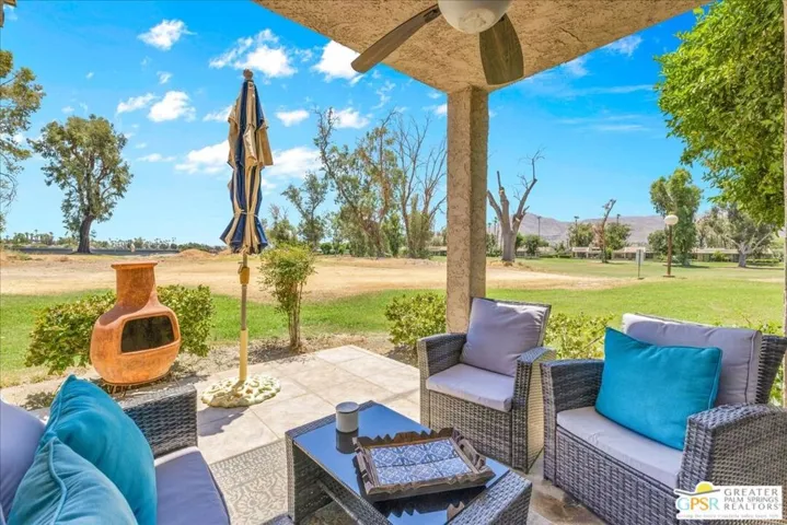 Beautifully updated 2BD/2BA end unit in the sought-after West Gate community with a premier Palm Springs address. Rare private location with no imposing neighbors and situated along the Marriott Resort golf course between the 10th and 11th fairways. Interior highlights include: vaulted ceilings, smooth walls, recessed LED lighting with dimmers, Italian tile flooring, updated fixtures, and upgraded lighting throughout. The refreshed guest bath features Italian tile, pebble-stone shower floor, quartz counters, contemporary sinks, new hardware, and designer backsplash.Kitchen offers: quartz countertops, copper apron-front sink, stainless appliances, and plantation shutters. The primary suite includes its own renovated bath. Modern upgrades: WYSE smart-home system, tankless water heater, 18-panel solar array with 220-amp service (ideal for EV charging) + Level 2kW buyback, garage ventilation fan, added insulation, and loft storage with pull-down ladder.This residence delivers seamless indoor/outdoor living, contemporary finishes, and extensive improvements throughout, capturing the essence of modern Palm Springs living.