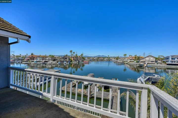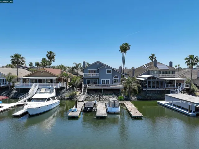 Price reduced! Lovely spacious waterfront home with stunning views, huge private double U-shaped boat dock, and a 3 car garage. This popular floor plan features 5 bedrooms (possibly 6), 3 bathrooms, large kitchen with breakfast nook, dining room, and laundry room. Huge 5th bedroom could be used as a game room. Features downstairs bedroom / bathroom. Spacious, inviting family room features a fireplace and sliding glass door leading to the covered deck. Living room features vaulted ceilings. Large kitchen features an island and an oversized breakfast nook with windows showcasing views of the water. Primary suite features sliding glass door to balcony and a huge walk-in closet. This well-maintained home has known only one owner. Enjoy spectacular sunsets over Mount Diablo and breathtaking water views. Perfect for entertaining! Oversized driveway and possible side yard access. Room for all of your water toys! Access to over a thousand miles of delta waterways from your backyard! NO HOA!