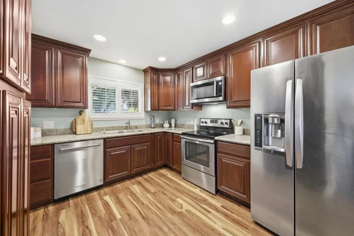 Beautifully remodeled home with bonus living space! A spacious, permitted sunroom not included in the square footage, enhances daily living with flexible year-round use, featuring removable windows that offer warmth in winter and breezy comfort in summer. The inviting living room showcases a striking bay window, while the updated kitchen features rich cabinetry, granite slab countertops, and stainless steel appliances. The family room centers around a stunning fireplace. The primary suite features a remodeled bath with an elegant vanity, a quartz slab countertop, a stylish tile surround, and tile flooring. The hall bath is similarly refreshed with tub-over-shower. Additional upgrades include new flooring throughout, new heater & A/C, new water heater, recessed lighting, updated light fixtures, dual-pane windows, and a SunRun leased solar system for energy savings. Other highlights include RV parking, extra-large linen/storage closet, and newer fencing on a private 6,288 sq. ft. lot. Fantastic locationwalk to Frost Elementary, featuring the highly regarded Indigo Program, as well as Herman Intermediate, plus Santa Teresa High. Convenient to commuter routes, shopping, and dining.