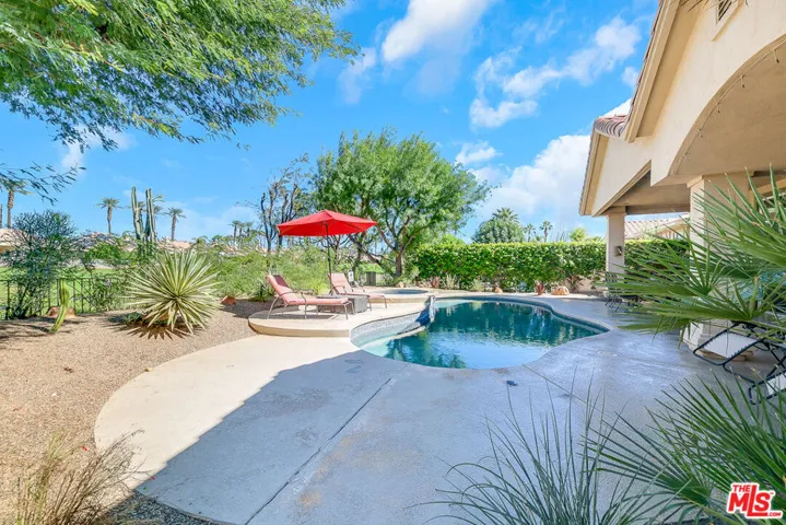 Live behind the gates of the prestigious La Quinta Fairways. This beautifully upgraded 3-bedroom, 2.5-bath home offers approximately 2,224 sq. ft. of refined desert living overlooking the 6th fairway of the Dunes Course. Enjoy sweeping golf course views framed by mature landscaping and trees that provide the perfect blend of beauty and privacy. Step inside to an elegant, open floor plan featuring high ceilings, Travertine flooring, plantation shutters, and a dual-sided fireplace connecting the living and family rooms creating a warm and inviting atmosphere. The chef’s kitchen is highlighted by Corian countertops and opens to a spacious dining area with sliding glass doors leading to the backyard retreat. The primary suite showcases a double-door entry, large wardrobe closet, and a spa-like en-suite bath with dual sinks. A rare and desirable feature, the office currently used as a fourth bedroom offers ideal guest accommodations or a flexible space for work or relaxation. The low-maintenance backyard is a true desert oasis, featuring a sparkling Pebble Tec pool and spa, new pool heater, covered patio, misting system, and cool deck perfect for entertaining or unwinding on warm desert evenings. Additional highlights include dual A/C units with Nest thermostats, ceiling fans throughout, a laundry room with sink, and a two-car garage with built-in cabinetry and space for a golf cart or workshop. La Quinta Fairways is a small, guard-gated community offering low HOA dues that include cable, internet, front yard landscaping, and 24-hour security.