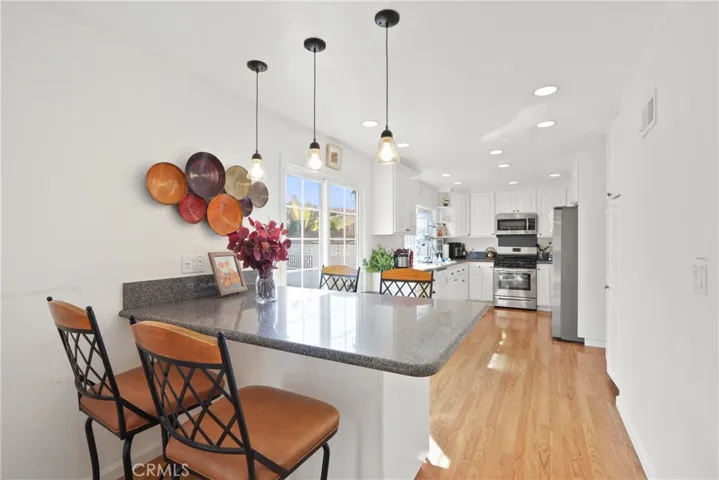 Welcome to 1770 E Sandalwood Ave, a spacious two-story home located in the desirable Northeast Anaheim neighborhood. Public records show 4 bedrooms and 2.5 bathrooms; however, the property offers 6 bedrooms and 3.5 bathrooms with a 2-car garage (buyer to verify all permits). The open floor plan is bright and inviting, perfect for everyday living and entertaining. The main level features vaulted ceilings, a formal living room with rich wood flooring, and a separate family room with built-ins and a cozy brick fireplace. The remodeled kitchen includes white cabinetry, granite countertops, stainless steel appliances, and a breakfast bar that opens to the dining area.