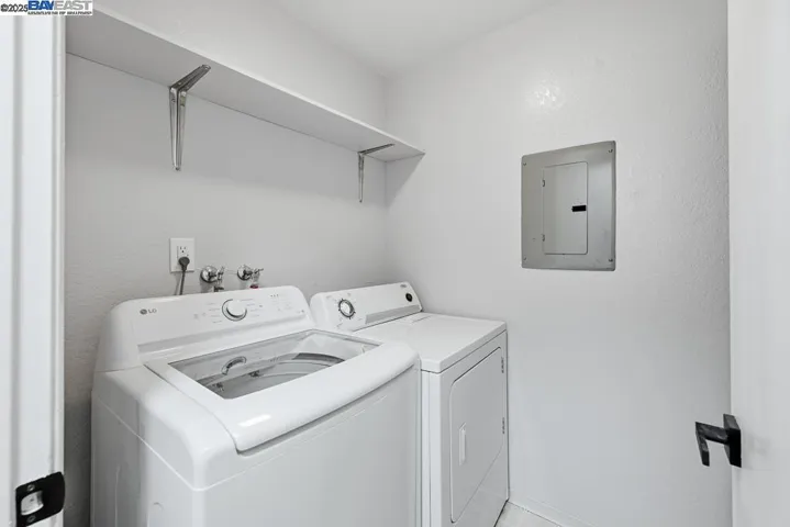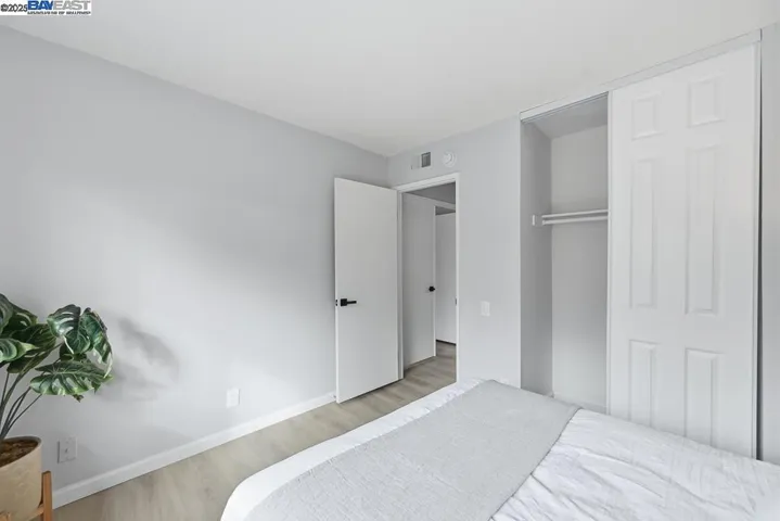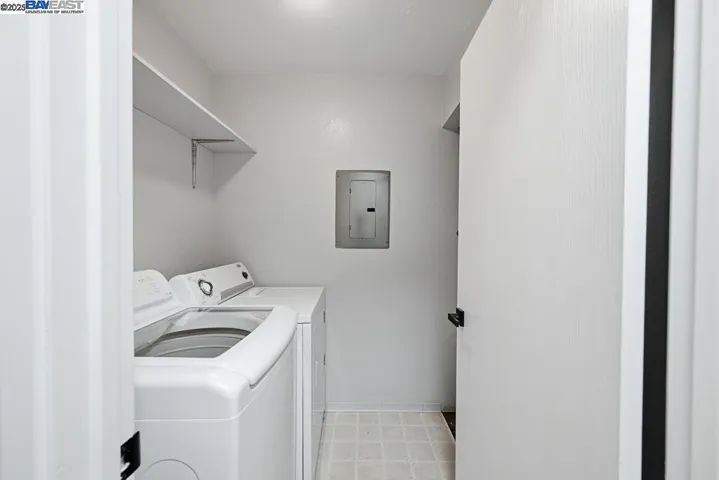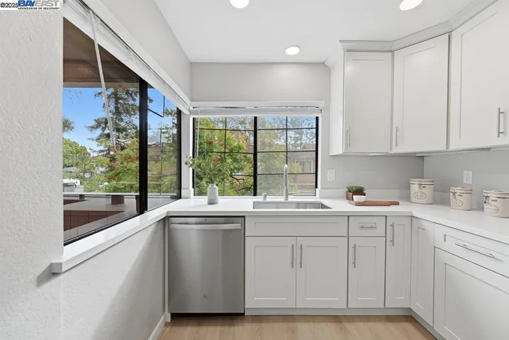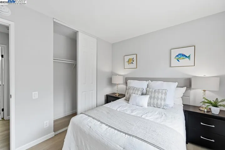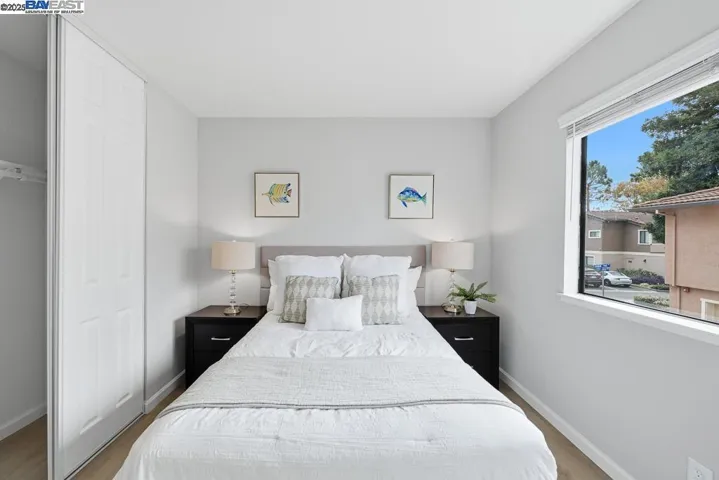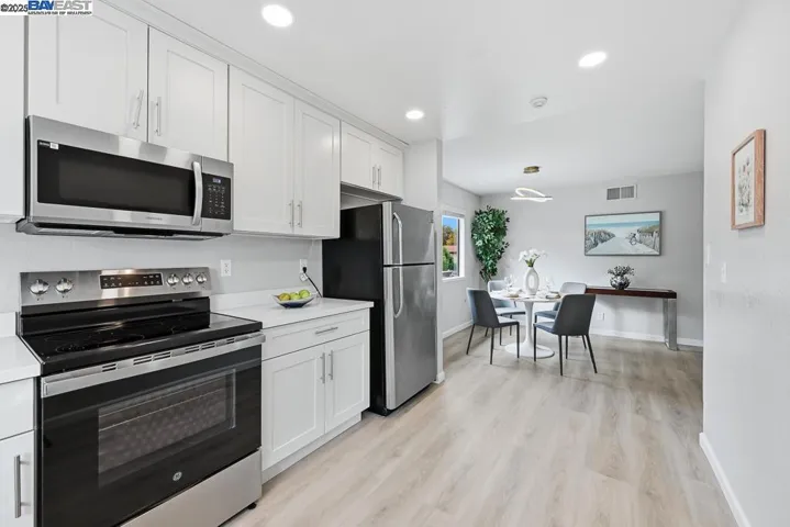 Bright and beautiful upstairs corner unit with 2 car garage below. This home features brand new low maintenance SPC vinyl flooring thruout. Enjoy a modern kitchen with new cabinets, quartz countertops, and new stainless steel appliances and recessed led ceiling lights. Convenient laundry room includes full size washer and dryer. Two spacious bedrooms. Primary bedroom has walk in closet. Updated bathroom with new vanity and quartz surround bathtub and shower door enclosure and elegant finishes. Move in ready and designed for comfortable, low maintenance living! Conveniently located near freeway access, BART, shopping, schools and parks. HOA dues include water and insurance.