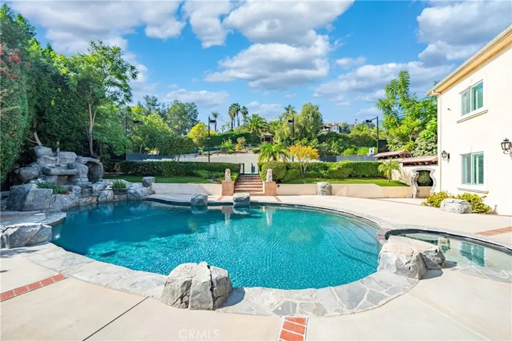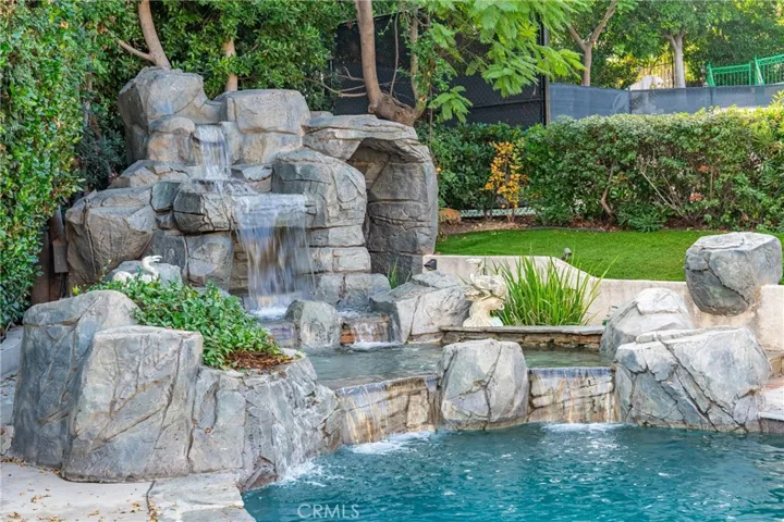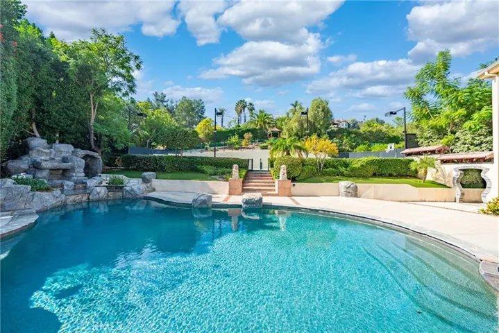 The resort-style backyard is a true sanctuary—complete with a sparkling pool and spa, waterfall feature, full-size tennis court with lighted, outdoor BBQ pavilion, gazebo, and a tranquil Chinese-style garden surrounded by fruit trees and lush landscaping.