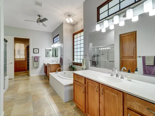 From the moment you enter the private gated courtyard you will see a magnificent stone floored entryway leading to the detached CASITA and beyond to the NEW LEADED GLASS FRONT DOOR entrance to this fabulous home. As you enter the home, you will realize this is not just one of the LARGEST PLANS Sun City has to offer, but a totally upgraded and redesigned living room. Four inch wood shutters, a ceramic tile floor and a walled fireplace showcase your arrival. The wing wall in the living room has been removed allowing a larger than normal living area. All rooms have been color updated and ready to move in. The Master Suite including a shower and tub – private water closet – large walk-in closet with built-ins and completely redecorated is soothing to the eye. This home has a private dining room with a buffet and table seating for eight. The stainless steel kitchen built-ins with windows and doors leading to the beautiful golf course and has a 3 seat sit down bar for party enjoyment. A Butler’s Pantry is conveniently located between the kitchen and dining room. On the other wing of the property is a nicely decorated secondary bedroom with its own bath. The laundry room has added cupboards, a washer and dryer and leads out to a three car garage with a split air conditioner and extra storage. A detached CASITA for guests is provided and is usually everyone’s favorite area for privacy and rest. It has a sitting area and large bed to make guests comfortable. A wall of windows looks out to the golf course, spool area, built-in BBQ and covered areas and for outdoor pleasure and viewing of the Mountains. The rear yard is south facing with a tremendous MOUNTAIN and GOLF COURSE VIEW. Please come and see this beautiful home – you won’t be sorry. Sun City Shadow Hills offers two golf courses, tennis courts, pickle ball courts, 2 Fitness Centers and a Clubhouse with a billiards room, meeting rooms, and a library are provided to homeowners. The Club has a restaurant, bar and other areas for your enjoyment. Come and meet our friendly staff.