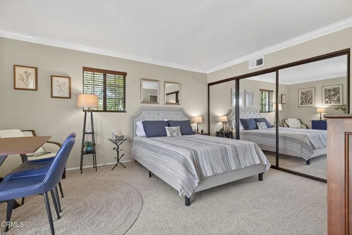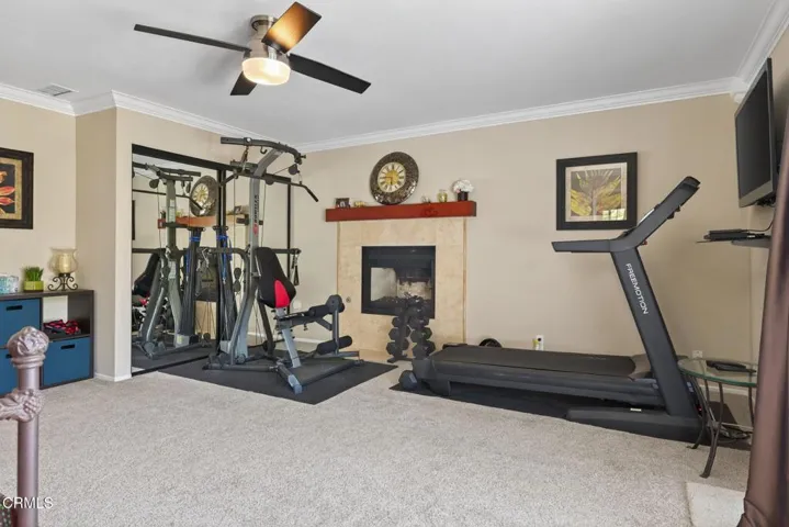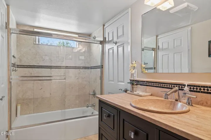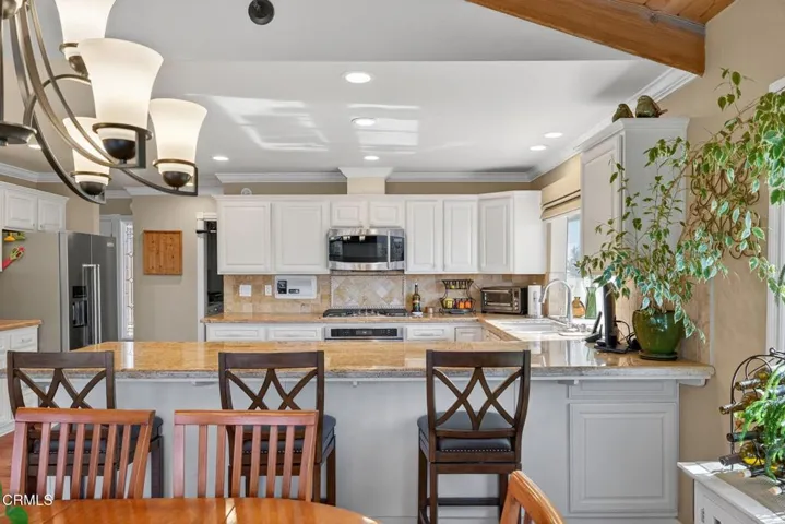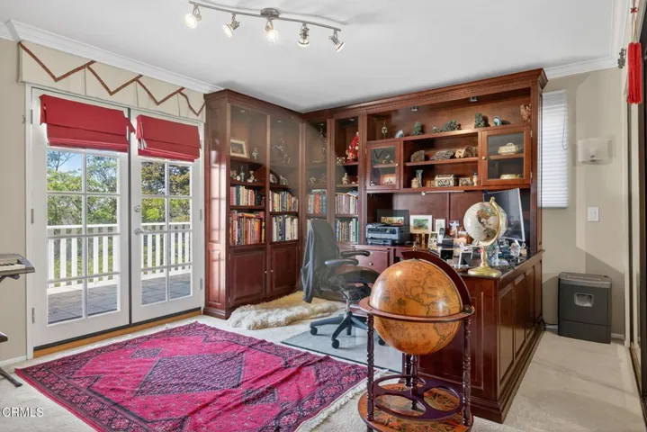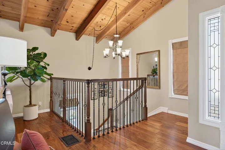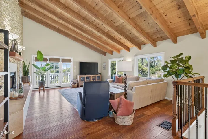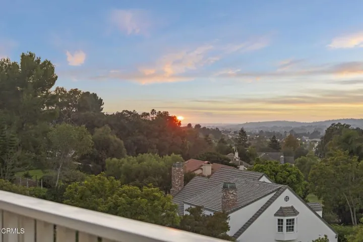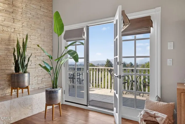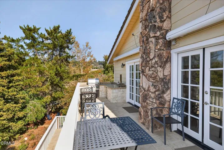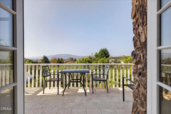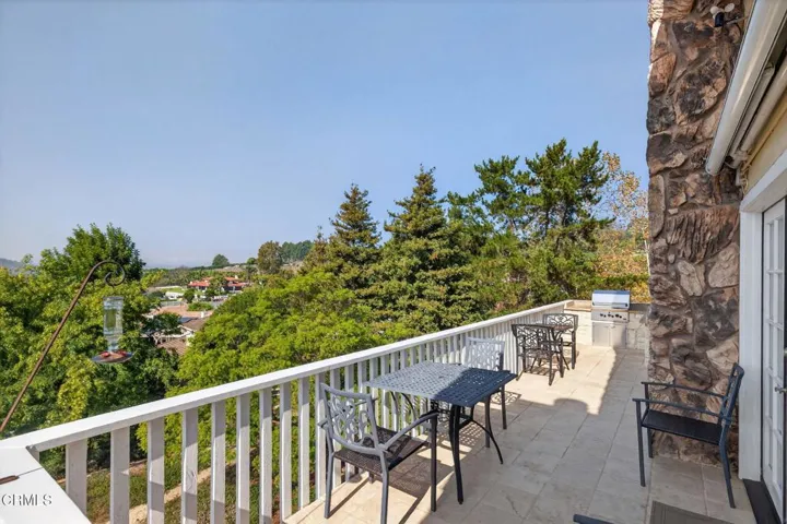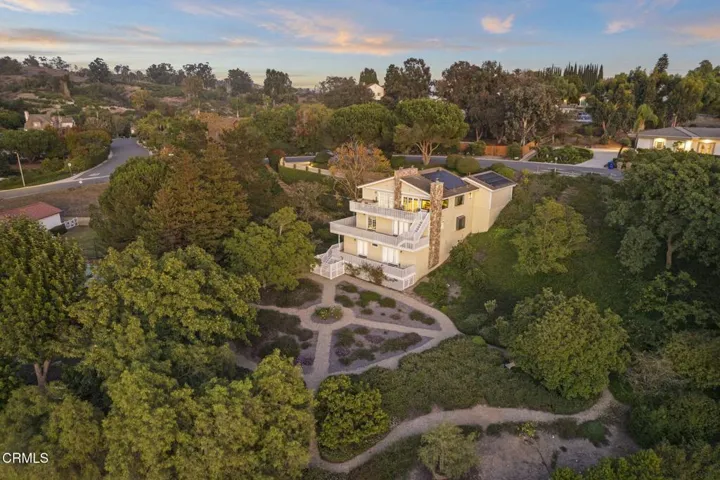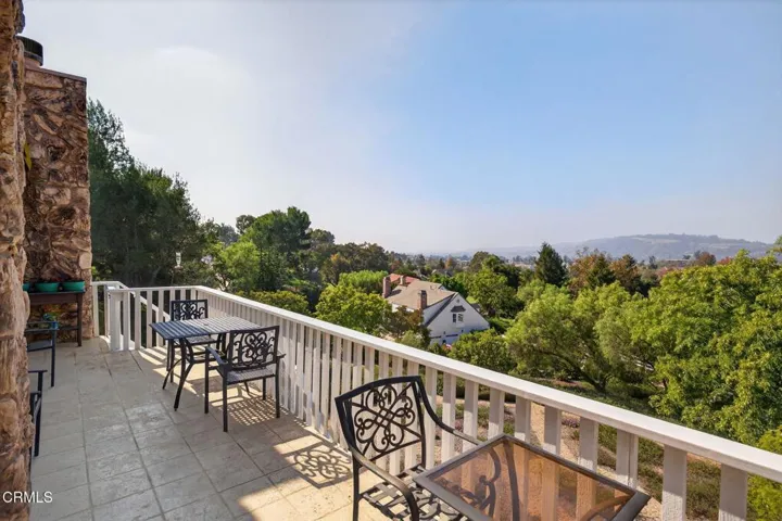 Perched in the Serene Terra Bella Estates neighborhood on a sprawling 1-acre lot, this 3,560 sq ft, 4-bedroom, 4-bathroom architectural stunner offers breathtaking vistas of Camarillo from every room and all three expansive private balconies–your daily dose of coastal-inspired tranquility. With paid solar panels eliminating electricity bills and a Pebble Stone driveway welcoming you home in style, energy efficiency meets effortless curb appeal in this haven of modern comforts and natural beauty. Step inside to vaulted ceilings adorned with exposed natural wood beams and elegant oak woodwork framing every window and door, complemented by newer dual-pane glass for whisper-quiet serenity. Recessed lighting bathes the open living spaces in a warm glow, while crown molding and newer stair railings add refined touches throughout. The heart of the home shines with Acacia engineered hardwood floors flowing seamlessly from the living room to the gourmet kitchen, outfitted with a premium KitchenAid oven and fridge, a built-in wine fridge, a whole-house intercom for seamless communication.Retreat to the primary suite, a true sanctuary featuring an elegant bedroom with a marble accented fireplace and an ample bathroom with mercerized tile floors, a dual-head, upgraded shower with quilted tile walls, a sunken spa tub, a large vanity, and separate makeup area complete with its own sink. Unwind by the versatile wood-and-gas fireplace, slip through French doors to your balcony, or organize in the cedar-paneled walk-in closet. Nearby, see the office (or bedroom) with adjacent full bathroom complete with travertine floors. On the lower level, discover two bedrooms, one with travertine lined fireplace and ceiling fan, which share a travertine-enhanced full bath –perfect for wellness or work-from-home vibes.Outside, the magic continues: Fire up the BBQ on a balcony decked in tumbled marble, then wander to your lush backyard oasis. Privacy abounds thanks to carefully designed landscaping and mature trees, while a dedicated garden and a bounty of fruit trees–apple, orange, lime, tangerine, avocado, and lemon–promises fresh harvests year-round. Stay cool with central AC, cozy up by one of three fireplaces, and rest easy with ADT security, a newer water heater, and furnace–all move-in ready for those craving luxury living with low-maintenance perks.This is more than a home; it’s your elevated escape