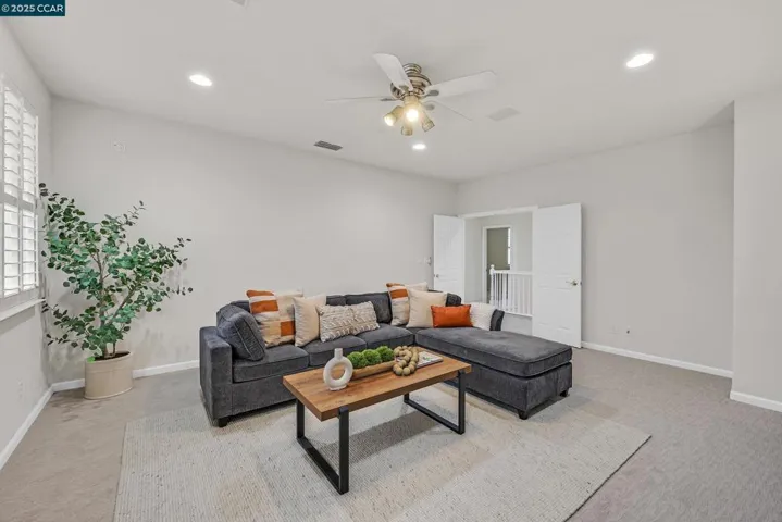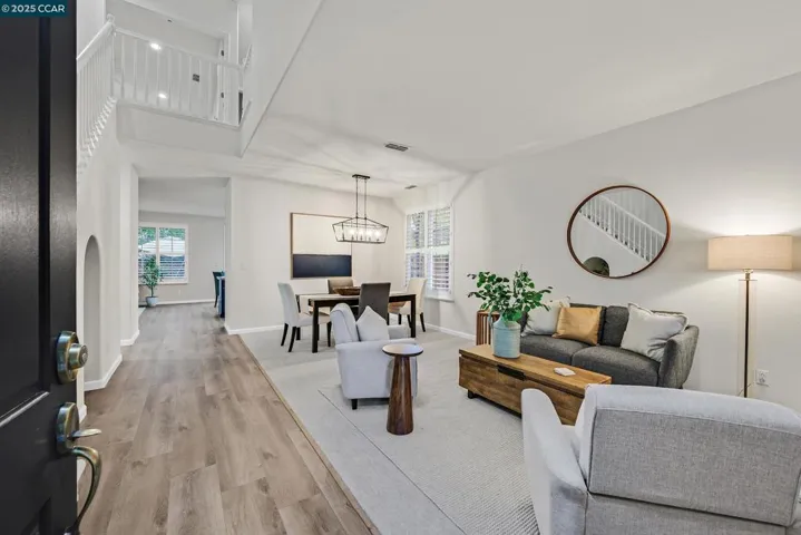 Located in one of Danville’s most sought-after neighborhoods, California Meadows, this beautiful home sits at the end of a serene court on a spacious lot offering privacy and extra land on the side. With 5 bedrooms, 2.5 bathrooms, and an oversized loft, the 2,623 square feet of living space feels open and inviting. The welcoming front porch and striking curb appeal set the tone for the stunning interior featuring soaring ceilings and abundant natural light. The expansive formal living and dining rooms flow seamlessly into the gorgeous kitchen with granite counters, 4-burner gas range, oversized island, eat-in nook, and ample cabinetry, all overlooking the cozy family room with gas fireplace. A dedicated office/den is conveniently located off the family room. Upstairs, the large loft is ideal for a game room or media retreat, while the impressive primary suite boasts a spa-like bath with dual vanities, jacuzzi tub, separate shower, and an oversized walk-in closet. The backyard is a true oasis with a lush lawn, mature trees, and an expansive patio with retractable awning perfect for entertaining. Additional highlights include recessed lighting, plantation shutters, brand new flooring, fresh interior paint, and baseboards throughout. This home is perfection and is move-in ready!