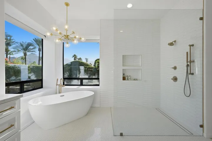 Welcome to an elegant desert retreat in the coveted gated community of Painted Cove in La Quinta. Thoughtfully remodeled and beautifully appointed, this light and bright residence offers the perfect blend of comfort, sophistication, and indoor-outdoor living. This stunning residence captures the essence of desert luxury living — stylish, spacious, and ready to enjoy.Step inside to discover an inviting open-concept layout featuring soaring ceilings, expansive windows, and stylish finishes throughout. The spacious great room showcases a stunning fireplace, modern furnishings, and seamless flow to the outdoor living areas — ideal for entertaining or quiet relaxation. The remodeled kitchen is a showpiece with quartz countertops, a large island, custom cabinetry, and high-end stainless appliances. Includes newer mechanicals, 3 wine fridges and 2 Tesla chargers.The home offers three spacious bedrooms each designed for privacy and comfort. The primary suite is a true retreat with a spa-like bath, generous walk-in closets, and direct access to the patio.Set on an expansive corner lot, the backyard is an entertainer’s dream — complete with a sparkling pool and spa, multiple lounge areas, and lush landscaping that creates a sense of tranquility and seclusion. Enjoy morning coffee under the covered patio or evening gatherings around the BBQ while taking in the beautiful mountain backdrop.Whether you’re seeking a full-time residence or a desert getaway, this home captures the essence of desert living. Enjoy low HOA fees and an amazing community green space where the neighborhood comes together in a pet friendly environment. Homes like this don’t come on the market often. This is a must-see to fully appreciate its design, character, and location. Painted Cove is a highly sought-after enclave within La Quinta, known for its peaceful atmosphere and close proximity to premier golf courses, hiking trails, walking distance to Old Town La Quinta, and world-class dining and shopping.