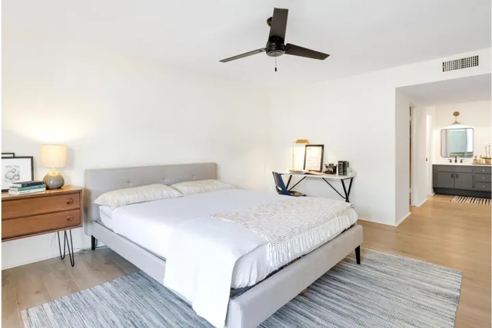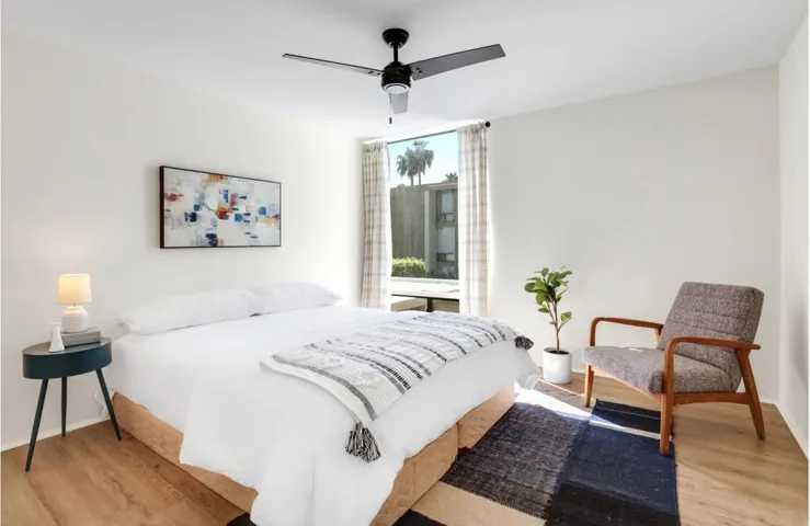 This beautiful and fully renovated 2-bedroom, 2-bath condo on fee land is located in the architecturally significant Casa Canyon community, designed by William F. Cody. Ideally situated in South Palm Springs, this property is surrounded by breathtaking mountain views, hiking trails and is just minutes from downtown, dining, and entertainment. This property serves as a fantastic option as an investment property or an easy no fuss pied-a-terre for weekend and holiday getaways for family, friends and snowbirds alike!The expansive primary suite offers exceptional privacy and features an en suite bathroom with a separate double vanity, a massive walk-in closet, and sliding doors that open to a spacious terrace with stunning pool and mountain views–also accessible from the oversized living room.The thoughtful floor plan provides great separation between the primary suite and the guest bedroom and second bath, offering comfort and functionality for residents and guests alike.The modern kitchen has great counter space and storage including a large pantry. It is equipped with a brand new refrigerator and electric cooktop, dishwasher, custom quartz countertops, and a stylish waterfall bar top. The open dining area flows seamlessly into the living space, creating a bright and social setting ideal for entertaining.The entire unit has been freshly painted and additional highlights include a large private storage room off the terrace, one assigned covered carport space, guest parking, and a community elevator scheduled for a complete overhaul and replacement. The unit is conveniently located on the second floor, one short flight up. *This condo is virtually staged and is unfurnished.*