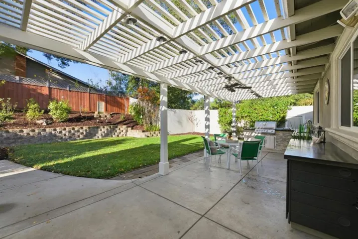 Beautiful upgraded home on a large 8140+/- SF lot, nestled in the Pierce Ranch neighborhood, across from Almaden Meadow Park. Step through a paver landscaped courtyard into a welcoming entry w/tile flooring, skylight & decorator mirrors. The living room boasts a cathedral ceiling, a large window looking out to front courtyard, & seamlessly blends into dining room combo ideal for entertaining. Gourmet kitchen is a cook’s dream, featuring a 6-burner Monogram range, professional Zephyr hood, glass tile w/decorator backsplash, quartzite counters, beautiful shaker cabinets w/soft-closing drawers, pantry cabinet & skylight offering functionality with flair. Relax in the family room beside the fireplace with a built-in entertainment unit or enjoy the private outdoor oasis, w/pergola, BBQ area, and many built-in cabinets with finished concrete countertops, great for family fun or entertaining. The primary suite features a slider out to a private patio and hot tub, providing a tranquil retreat. Remodeled en-suite bath features dual sinks, a spacious stall shower, and walk-in closet. Green thumbs will appreciate the side yard and fruit trees. Updated hall bathroom and engineered floors. Close to Almaden Schools, Quicksliver Park, Almaden Country Club, and shopping.