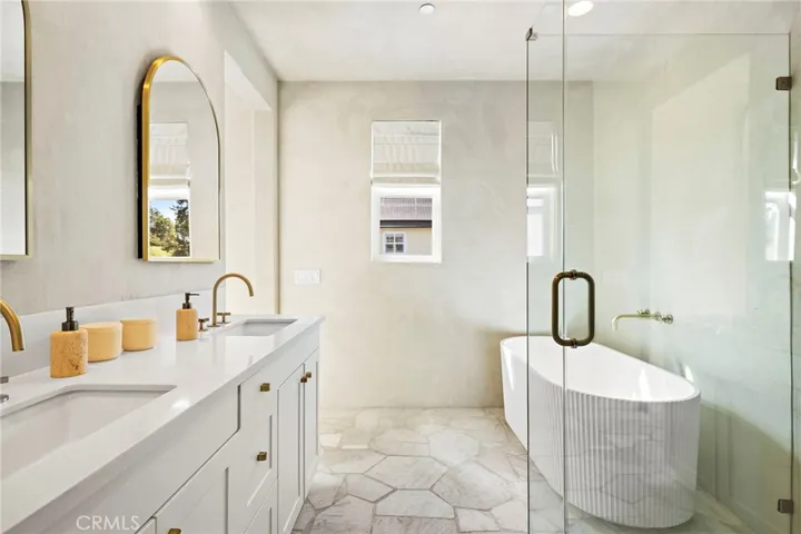 This coveted corner lot offers abundant natural light, privacy and a layout designed for both comfort and style. A charming wrap-around fenced porch greets you at the entry, offering an ideal space for morning coffee, evening relaxation, or gathering with friends and neighbors. Directly beside the home is a lush HOA-maintained greenbelt—a safe and convenient play space for kids and pets right outside your door. Inside, thoughtful designer upgrades elevate everyday living. The primary suite is a true retreat. Walls and ceiling are finished in luxurious Venetian plaster, delivering a warm, high-end aesthetic. The fully remodeled primary bathroom brings a resort-like atmosphere to your daily routine, featuring Concreta-finished walls and ceilings, striking quartzite flagstone flooring, and refined spa-inspired fixtures. Every bedroom in the home has been enhanced with custom closets for organization and effortless living. An outdoor sauna may also be included for those seeking the full home-wellness experience.