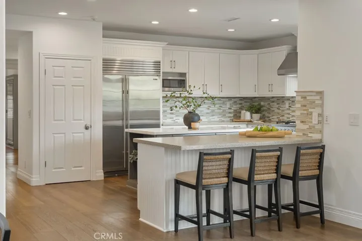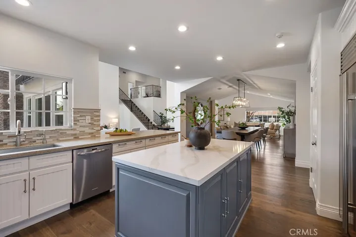 The kitchen features custom cabinetry, quartz countertops, a commercial-grade range, stainless steel appliances, and an oversized island with seating and backyard views. An adjoining bonus room is perfect for entertaining, complete with a built-in media center, surround sound, and designer bar.
