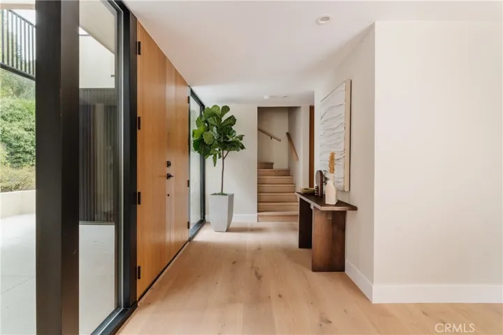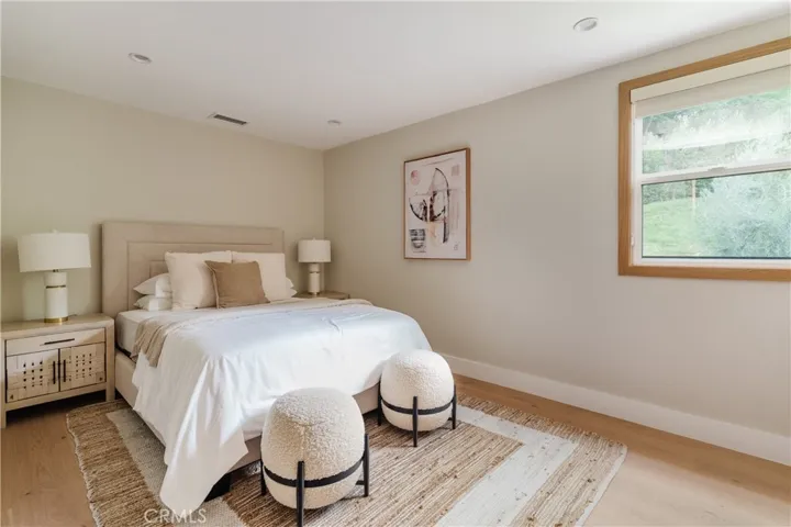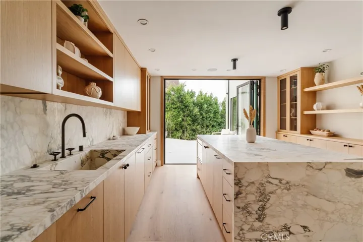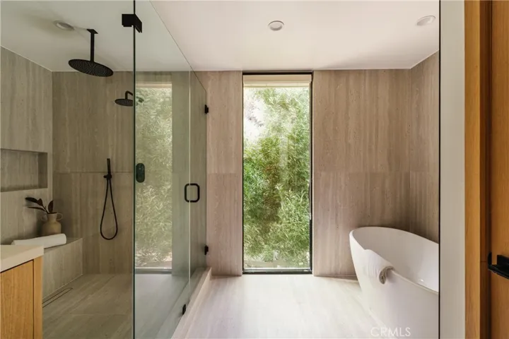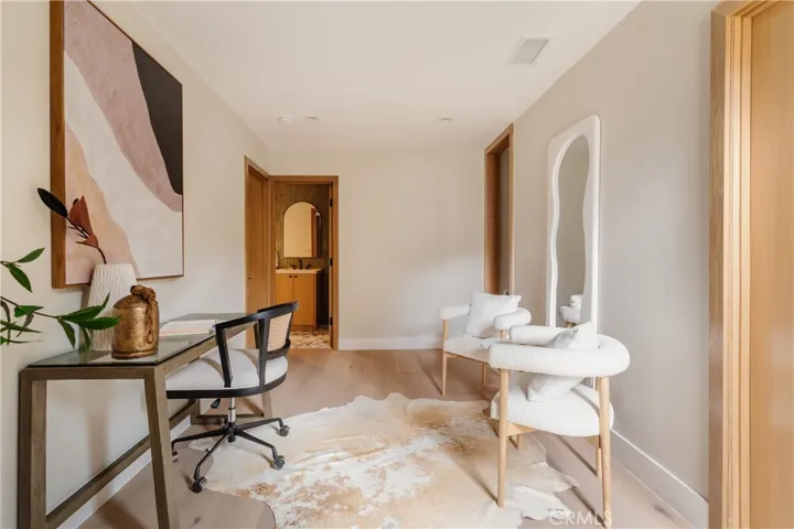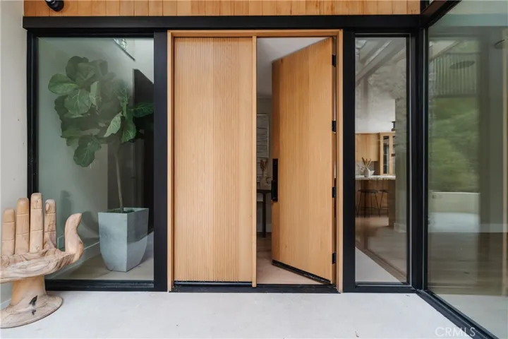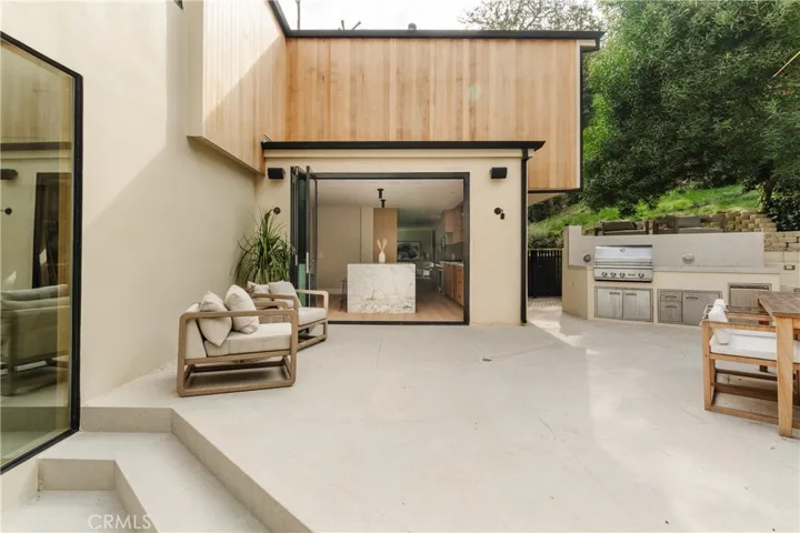 This strikingly reimagined mid-century residence, privately set south of the Boulevard in coveted Studio City. Every inch of this 3-bedroom, 2.5-bath home with an additional office reflects refined craftsmanship, natural warmth, and modern design. The exterior immediately captivates with rich cedar cladding and hand-laid stonework, setting the tone for the sophisticated interiors within. Inside, airy open spaces unfold across herringbone-patterned wood floors, framed by custom millwork and natural textures that evoke a sense of calm and connection. The heart of the home is the seamless living, dining, and kitchen area — bright, inviting, and designed for effortless entertaining. Floor-to-ceiling glass doors extend the space outward to a private patio with a built-in grill, perfect for gathering or relaxing under the California sun. The chef’s kitchen impresses with white oak cabinetry, Viola Monet Calacatta marble, paneled appliances, and sleek fixtures — blending organic materials with contemporary elegance. A powder room, laundry area, and attached two-car garage with EV charger complete the main level. Upstairs, the tranquil primary suite is a modern sanctuary with expansive windows, custom closets, and a spa-inspired bath featuring a soaking tub, walk-in shower, and dual vanities. Two additional bedrooms, a full bath, and a flexible den or office provide comfort and versatility for family or guests. Tucked in one of Studio City’s most desirable pockets, this home offers easy access to hiking trails, Mulholland Drive, Beverly Hills, and The Shops at Sportsmen’s Lodge — with Erewhon, Equinox, and top dining just minutes away. A private, polished retreat that embodies elevated California living.