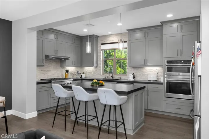 Step inside to discover a perfect floorplan with a bedroom suite and den on the entry floor for those who work from home or need a mother in law suite. Head up to the 2nd floor and find a gourmet kitchen featuring leathered granite countertops, a spacious pantry with custom organizers, gorgeous backsplash, top-of-the-line stainless appliances and beautiful glass pendants. The entire home is graced with wood look LVP floors with the exception of the secondary bedrooms, enhancing the home’s aesthetic appeal and functionality. The living room is light and airy and includes a white stone tiled media wall. Step out of the dining room and living room onto a large view deck boasting breathtaking mountain and sunset views. This level includes a large laundry room with included machines as well as a sink and second pantry plus a convenient powder bathroom.