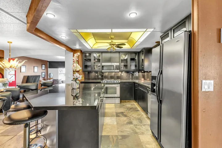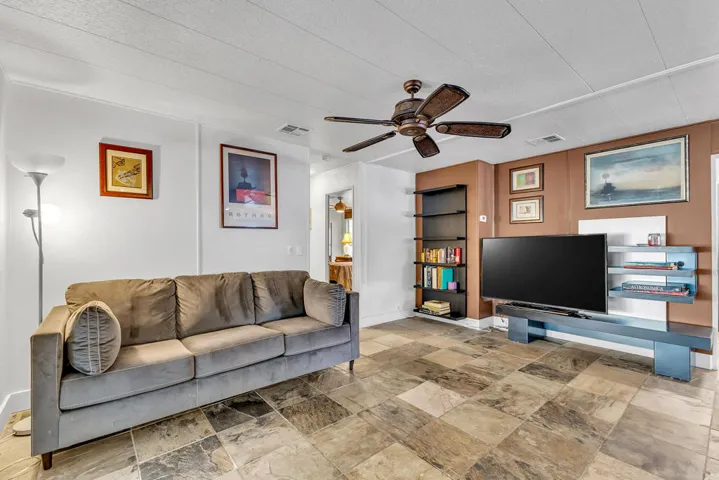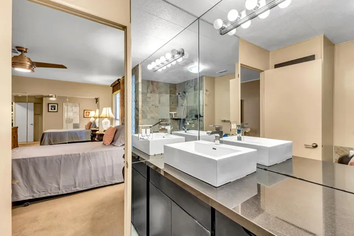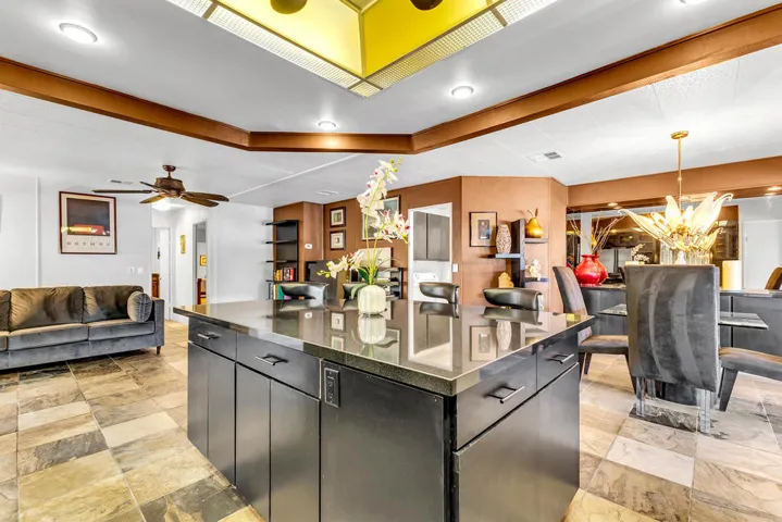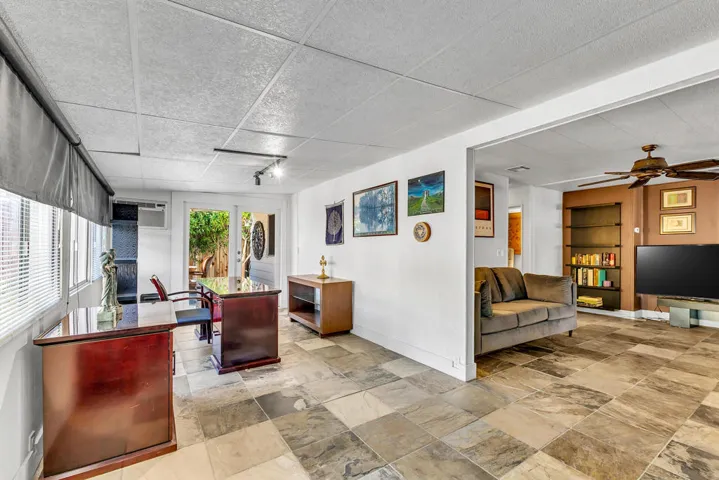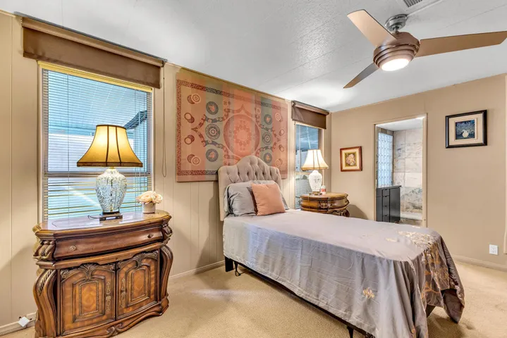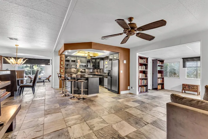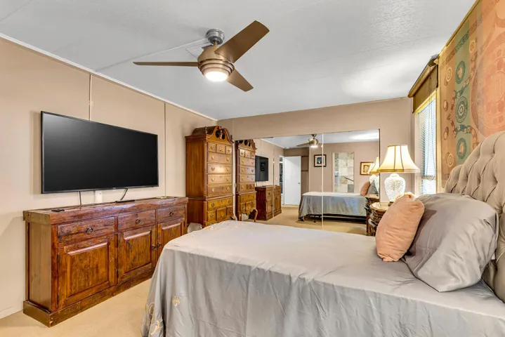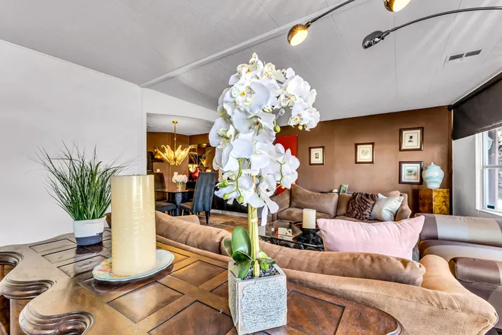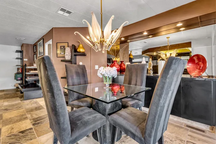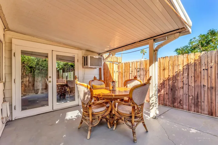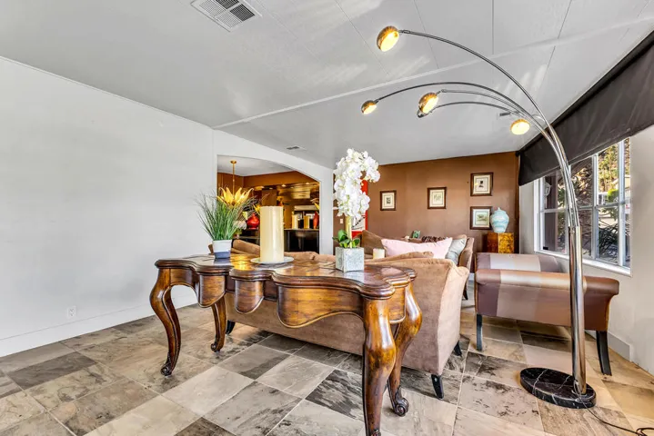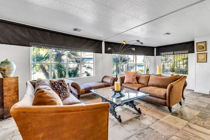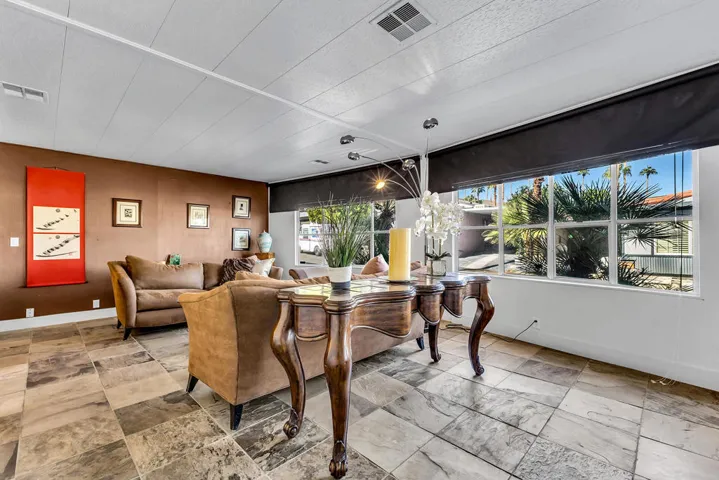 Parkview is a classic Mid-Century Modern community located in desirable South Palm Springs. This spacious 2 bedroom, 2 bath home also includes a versatile flex room–ideal as a home office, den, or creative space–with its own private entrance. The large kitchen offers generous counter space and abundant storage, perfect for everyday cooking or entertaining. Enjoy a secluded back patio with peek-a-boo mountain views, creating a quiet retreat for relaxing outdoors.Parkview is a 55+ community and management approval is required for residency. No short-term or long-term rentals are permitted. The current land lease is in place through 2027 and will convert to annual renewals thereafter. The park will be managed and maintained by the owners and on-site park manager.