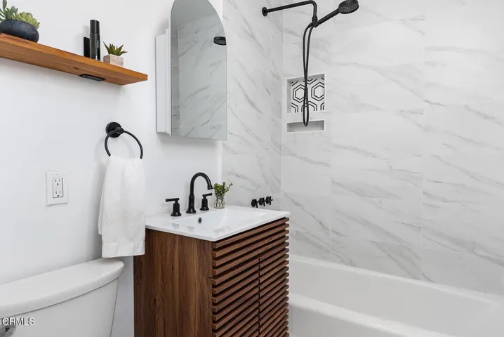 Hilltop views, style, and quick access to Debs Park! Where Montecito Heights and Rose Hill meet, this charming two-bedroom, two-bath bungalow is a fresh take on a classic home. Elevated above the street, it’s a private retreat tucked away from the city, but close to everything – the best of both worlds. A generous front porch patio overlooking the hillside leads into a modern, elongated living space anchored by a central kitchen. With bedrooms at each end, both featuring en suite bathrooms, the home presents a perfect balance of private quarters and inviting shared spaces. Off the sun-drenched den, find the open patio and backyard–the highlight of the home. This spacious outdoor area, ideal for al fresco dining and entertaining, flows seamlessly to newly added west-facing turf, a dreamy spot to enjoy sunset vistas. With the entrance to beloved Ernest E. Debs Park just down the street, nature lovers will love the hiking trails, Audubon Center and views of downtown Los Angeles. Foodies can dive in to Secret Pizza just half a mile away, and all the richness of Northeast LA surrounding — from Salvadorean cafecito at Cafe Juayua, Italian subs at The Heights Deli (both less than 2 miles away!) and Victorian vibes at Heritage Square Museum just a quick jaunt over the hill. A great condominium alternative or co-living option, this well designed home is close to both USC Hospital and Cal State LA – what an opportunity!