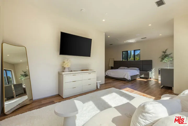 An Exceptional Contemporary Estate South of the Boulevard. Tucked discreetly behind private gates in one of Tarzana’s most distinguished enclaves, this custom-built contemporary residence exemplifies the pinnacle of modern design and luxury living. Completed in 2017 and set upon an expansive one-acre parcel, this 8,138-square-foot architectural showpiece combines grand scale with the finest craftsmanship and an effortless indoor outdoor flow. Upon entry, a soaring double-height foyer introduces interiors bathed in natural light, framed by dramatic walls of glass and impeccable detailing throughout. The open-concept living and dining spaces evoke a sense of grandeur, while the chef’s kitchen anchored by a substantial quartz island and fitted with bespoke cabinetry and integrated Thermador appliances caters effortlessly to both family living and formal entertaining. The main level also features a private study, state-of-the-art cinema, temperature-controlled wine room, and a generously appointed guest suite. Upstairs, the luxurious primary retreat offers a tranquil sanctuary, complete with a fireplace, two custom-designed dressing rooms, a spa-inspired bath with steam shower, and a private terrace capturing sweeping views of the manicured grounds. Outdoors, the estate reveals a resort-caliber setting designed for both relaxation and celebration. Accordion-style glass doors open seamlessly to a sparkling pool, spa, and cascading waterfall, surrounded by multiple terraces, a fire pit, and a fully equipped outdoor kitchen and barbecue pavilion. Further enhancing the residence are dual laundry rooms, a three-car garage, comprehensive security system with cameras, and the latest in smart home technology. A rare fusion of sophistication, privacy, and modern elegance this is an extraordinary Tarzana estate for the most discerning of tastes.