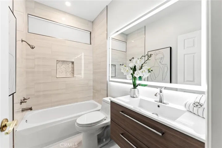 RARE SINGLE LEVEL HOME WITH CITY LIGHTS VIEW– Thoughtfully Renovated! Perched on a premium view lot, high in Anaheim Hills, this is 1 of only 18 single-level homes ever built by Presley in the early 90s. With no interior steps, 3 bedrooms, and 2 baths, this open-concept home combines modern luxury with timeless comfort. The light-filled interior boasts soaring ceilings, new Mohawk light colored flooring, fresh off-white paint, 7” baseboards, and new LED recessed lighting throughout. The elegant living and dining rooms flow together seamlessly—perfect for entertaining or relaxing in style. The all-new chef’s kitchen is a showstopper with 13’ ceilings, Shaker cabinetry, white quartz counters and backsplash to the ceiling, Café stainless appliances (including 2-drawer dishwasher), 36” copper farm sink, and center island opening to a cozy family area with gas fireplace—all with panoramic city light and mountain views. The primary suite feels like a luxury spa with vaulted ceilings, 8’ windows framing the view, and a designer bath featuring a 72” James Martin double vanity, white quartz top, 66” LED mirror, large format tile travels from floor into shower for a seamless look, marble-accented walk-in shower with custom lit shampoo niche and seamless glass door, and walk-in closet. The backyard is private, lush with grass and planters dotted with mini white roses, and ideal for sunset gatherings under the stars. Additional highlights include an inside laundry area, direct garage access, full sized driveway, garage cabinets, single-loaded street provides added privacy and ample street parking, newer vinyl fencing, and low $95/mo HOA for neighborhood landscaping and tree trimming. Top-rated Anaheim Hills schools, great walkability, and modern finishes make this the perfect forever home!