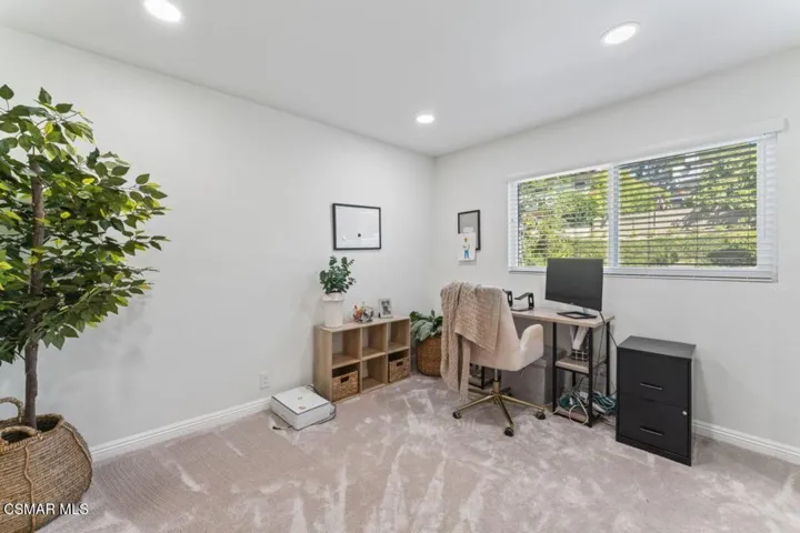 Welcome to a home that feels as timeless as it is inviting. Tucked gently into the sought-after Racquet Club Villas community of Thousand Oaks, this spacious 4-bedroom townhouse isn’t just a place to live. It’s a place to settle in, to grow into, to savor. With one of the largest floor plans in the community, offering over 2,250 square feet, there’s room for everyone and every lifestyle.Step inside and you’re greeted by soaring ceilings and sunlight pouring through expansive windows and sliding doors. The main living area exudes warmth, where evenings are spent by the glow of the gas fireplace and mornings are greeted with sweeping hillside views from the balcony. Here, watching sunsets becomes part of your daily rhythm.The open-concept layout flows effortlessly into the dining room and bar area, making this home an entertainer’s dream. Just beyond, the beautifully appointed kitchen is the true heart of the home. Complete with gleaming granite countertops, stainless steel appliances, and elegant cabinetry including glass display uppers, it invites gathering, conversation, cooking, and connection. French doors off the kitchen welcome the morning light and open to a private rear patio, perfect for al fresco meals, weekend grilling, or quiet moments of reflection.The primary suite, located on the main level, is a serene retreat. Wake up to treetop views, step outside onto the balcony for fresh air, and enjoy the convenience of dual closets and your own ensuite bath. A cozy den off the kitchen opens to the back patio as well, creating a perfectly tucked-away lounge for movie nights or game evenings.Upstairs, two additional bright and comfortable bedrooms share a well-lit bathroom, ideal for family, guests, or a dedicated workspace.Additional features include: newer windows throughout, indoor laundry room, a private two-car garage with extra storage, and newer wood-like flooring that ties the main level together with warmth and style.And then, of course, there’s the location: Thousand Oaks living at its finest. Nestled minutes from parks, hiking trails, shopping, restaurants, and top-rated schools, this home offers the balance of tranquility and convenience that makes this community so cherished.More than a home this is where life unfolds beautifully.Welcome to Racquet Club Villas.