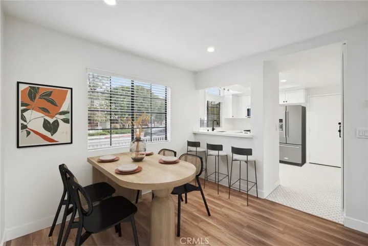 The bright living room boasts vaulted ceilings, a cozy fireplace, and access to a large front patio—perfect for relaxing or entertaining. The kitchen showcases white cabinetry, granite countertops, and brand-new stainless steel appliances. Tile and laminate flooring run throughout the home, creating a clean, modern aesthetic.