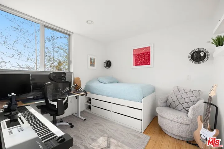 Rare opportunity at 950 Art Lofts in the heart of West Hollywood. This architectural townhouse features soaring 18-ft ceilings, an oversized industrial roll-up window, and striking custom glass-and-steel details. Polished concrete and bamboo floors flow through the open floor plan, anchored by a European-style kitchen with high-end appliances and designer finishes. Flexible mezzanine space, two primary suites with custom closets and spa-inspired baths, plus a bonus room for a third bedroom or office. Top-floor suite opens to a private patio with panoramic views of the Hollywood Hills, and the Hollywood sign. Central air, guest parking, and move-in ready. Walkable to the city’s finest dining, shopping, and nightlife. Set in West Hollywood’s most walkable enclave, residents enjoy effortless access to dining, shopping, and nightlife, with six artisanal coffee houses just steps from your door.