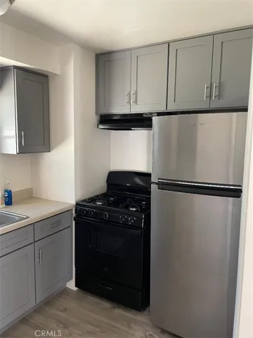 Remodeled kitchen with stylish gray shaker cabinets, stainless-steel sink, gas range, and refrigerator