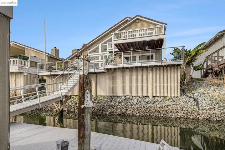 This wonderful 4-bedroom, 2.5-bath home offers over 3,100 sq. ft. of beautifully designed living space. Step inside to soaring cedar, vaulted ceilings and a dramatic catwalk overlooking the sunken living room—perfect for entertaining with a full bar and seating area. The spacious eat-in kitchen opens to a separate formal dining room and features access to an expansive vinyl deck, ideal for gatherings or sunset dining. Enjoy the beauty of hardwood flooring throughout and a versatile main-level bedroom that can double as an office, den, or guest space. The primary suite offers its own private retreat with a large deck and spiral staircase leading to the lower-level decking—perfect for taking in the water views. Energy efficiency meets luxury with owned solar, keeping your utility costs low year-round. There’s side yard access for all your toys and an extra-large U-shaped dock with a canopy, spacious enough to accommodate a table and chairs—perfect for relaxing or entertaining waterside. With desirable eastern exposure and access to over 1,000 miles of Delta waterways, you’ll enjoy endless boating, skiing, fishing, and paddleboarding adventures right from your backyard!