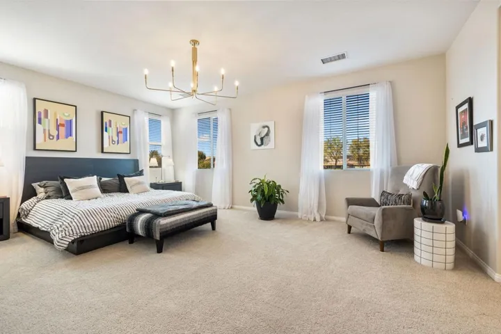 Welcome to this spacious 5-bedroom, 2-story home offering comfort, functionality, and style throughout. The thoughtful floor plan features a convenient first-floor bedroom, a formal dining room, and a versatile den ideal for an office or playroom. The kitchen includes ample cabinetry, granite countertops, and a charming breakfast nook with direct access to the backyard. Upstairs, a large loft provides additional living space, while the primary suite serves as a private retreat with dual vanities, a makeup vanity, a soaking tub, and a separate shower. Outside, enjoy the covered patio surrounded by lush landscaping and the added privacy of backing to a peaceful greenbelt–creating the perfect setting for relaxation and entertaining. Located in the 55+ community of Trilogy Polo Club.