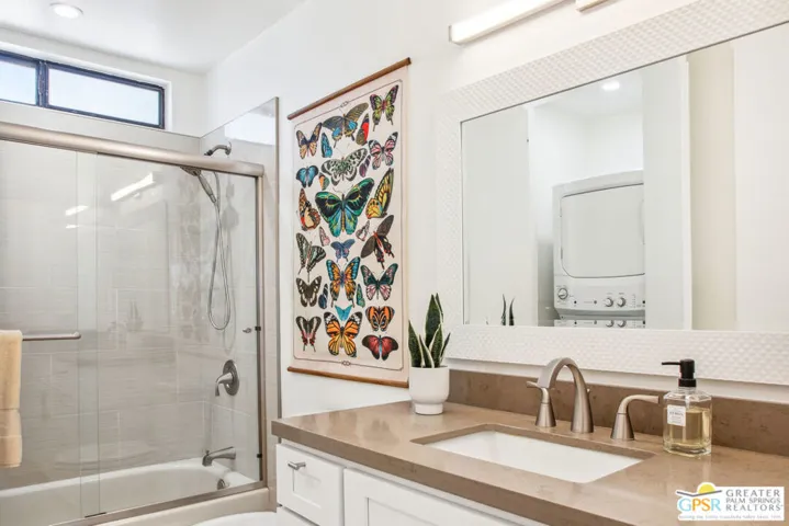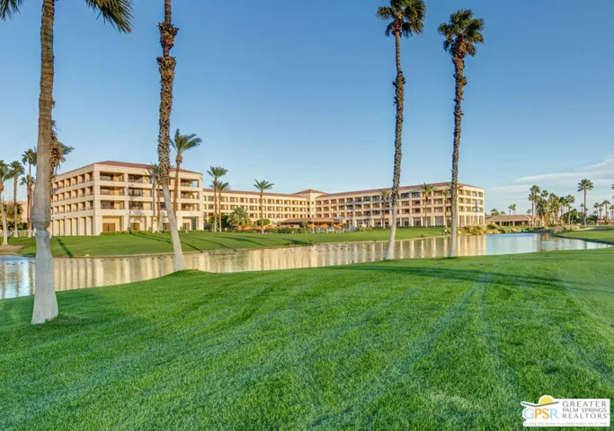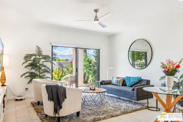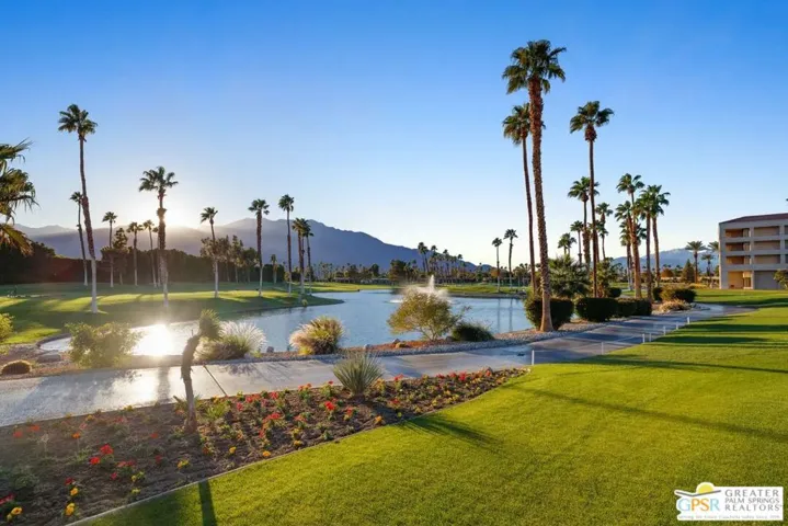 STUNNING SOUTH-FACING CONDO WITH PANORAMIC MOUNTAIN, FAIRWAY & LAKE VIEWS! This beautifully remodeled 1-bedroom, 2-bathroom condominium has a coveted southern exposure that floods the space with natural light and showcases magnificent, unobstructed views of the mountains, fairway, and lake. Designed with a modern midcentury flair, this home is an absolute standout! Step inside to discover a bright, open floor plan with soaring 9′ ceilings, elegant porcelain tile flooring, and glistening white quartz countertops. Thoughtful upgrades include new light fixtures, ceiling fans, energy-efficient LED lighting, under-counter water filtration and a suite of newer appliances, including a full-size washer & dryer, refrigerator (recessed valve with copper plumbing), dishwasher, and hot water heater. Outside, the private gated front courtyard welcomes you with flagstone accents and a charming sitting area with views of the mountains. The expanded rear patio, professionally desert-scaped with flagstone and vibrant water-wise plants, provides a perfect retreat to relax and soak in the breathtaking views. Refreshing pools and spas are steps away from both the front and rear patios. The finished garage features a new door, updated lighting, sheetrock, and shelving for extra storage. This home is nestled in a peaceful interior location on the Lagos #4 green and very close to the serene Arroyos greenbelt with meandering paths featuring panoramic views of the surrounding mountains. It is part of a vibrant, amenity-rich Desert Princess community that offers resort style living with a renovated fitness center, full service spa, tennis, pickleball, bocce ball, basketball, horseshoes, 27-hole championship golf course with preferred tee times and homeowner discounts, 3 practice greens, Golf Shop with on-site professionals, 34 sparkling pools & spas, Clubhouse with restaurant and bar (no monthly social fee), homeowner discounts at the Club and the on-site Doubletree Palm Springs Golf Resort Hotel by Hilton and electric vehicle charging ports. All this, just 10 minutes from Downtown Palm Springs and 20 minutes from El Paseo’s premier shopping & dining. Close to the first segment of the CV Link (a trail for pedestrians and bikers that will span the Coachella Valley upon completion). HOA dues include: high-speed Internet & cable (HBO & Showtime included) 2 cable boxes with DVR service, exterior water, trash, and recycling and landscape maintenance. Offered furnished per inventory. With short-term rentals allowed and a land lease extended to 2069, this home offers the perfect blend of luxury, lifestyle, convenience, and investment potential. MUST SEE! THIS ONE WILL NOT LAST.