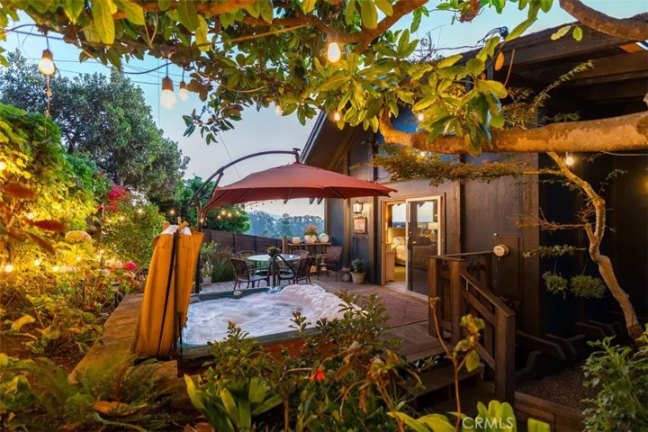 Outside, the home is surrounded by meticulously landscaped gardens, front and back, designed for privacy and serenity. The backyard features a hot tub in a secluded, beautifully landscaped setting, surrounded by mature fruit trees that enhance the sense of lush coastal living.