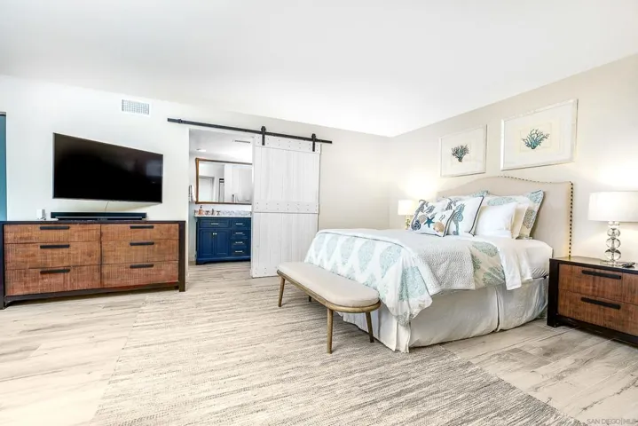 RELAX & STAY IN OUR CORPORATE RENTAL ~ GORGEOUS OCEAN VIEWS FROM YOUR UPSTAIRS DECK & first floor patio! Step inside this modern gem & you’ll be greeted by a wide entry area, modern railings, handsome porcelain tile wood plank flooring, exquisite lighting & finishes! Unwind in your bright & open living room featuring cathedral ceilings, electric fireplace for your year round pleasure. This unit has been highly upgraded throughout the years, providing a current, warm and inviting spaces, geared for your comfort and enjoyment! Most recent upgrades not pictured include electronic blinds & LED canned lighting throughout! SEE SUPP FOR MORE DETAILS! The efficient kitchen is very-well stocked, the cathedral ceilings and french doors to your oversized deck allow you to take in the sea breeze & the beautiful sunsets from inside and out! Enjoy the electric fireplace with beautiful undermount lighting, SMART TVS in living room and primary bedroom. Enjoy the spacious garage with direct entry and driveway parking for when you wish to pop in and out quickly. This unit is buffered from the freeway and located at one of the highest points to enjoy a panoramic ocean view! Close to all the best of coastal living including shopping at Flower Hill/Whole Foods, Gelson’s, fine dining, parks, & the Del Mar Fairgrounds & Racetrack. Don’t let this one pass you by! The unit is meticulously maintained, elegant yet homey! You will anticipate arriving and be sad when you have to leave! Spindrift is one of the most desirable communities in Del Mar, walkable, with cool ocean breezes and just a short stroll to the beach! Treat yourself & unwind with us!