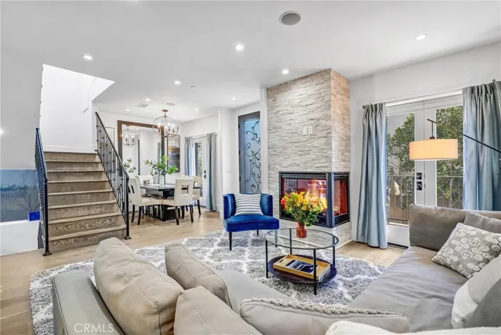 On the main level, you’ll find a versatile fourth bedroom (perfect as a den, home office, or Zoom room), an open-concept kitchen, dining, and living area complete with a cozy fireplace, and a full bathroom. The kitchen is both stylish and functional, featuring quartz countertops, a gorgeous backsplash, and seating for two. It flows seamlessly into the dining area, which comfortably accommodates four or more. Step out onto the balcony to enjoy fresh air, space for a gas grill, and seating for six perfect for outdoor meals or relaxing evenings.