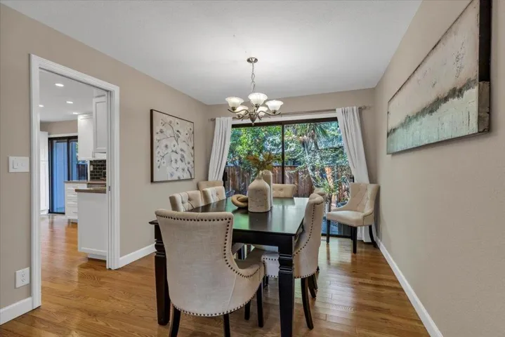Stylish corner unit townhome in the desirable Courtstyle community of Los Gatos with access to top rated Los Gatos schools. The main level features hardwood floors, fresh paint, recessed lighting, a spacious living area with a cozy gas fireplace, and a formal dining area. The remodeled kitchen is finished with crisp white Shaker cabinetry, quartz counters, stainless appliances, and abundant storage including a large pantry, all overlooking the backyard. Upstairs, the vaulted primary retreat offers a private balcony, gas fireplace, and a spa inspired bathroom with double sinks, skylight, oversized tile shower, and walk in closet. Additional highlights include updated secondary bathrooms with modern finishes, convenient interior laundry, double pane windows, new carpet upstairs, and a two car attached garage. The rear yard offers generous patio space with café lights, creating a private outdoor setting for entertaining or gardening. Turnkey living in a prime neighborhood and truly a must see.