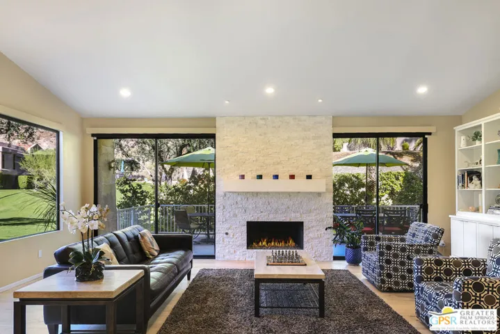 This spacious and beautifully maintained home is located in the desirable Andreas Hills Condominiums. Elevated above neighboring properties, it offers exceptional privacy and abundant natural light. Through elegant double glass doors, you are welcomed into an expansive living and dining area designed for entertaining, featuring a picture window that frames breathtaking mountain views and direct access to the patio. The kitchen is both stylish and functional, showcasing an artistic tile backsplash and a charming breakfast nook. Sliding doors open to a private patio, and there is convenient access to the attached garage and indoor laundry area. The primary suite is generously sized, with a luxurious bathroom that includes dual sinks, a soaking tub, a separate shower, and two walk-in closets. The guest bedroom is thoughtfully separated for privacy, featuring an ensuite bath and access to a covered patio. A dedicated office also opens to a patio and can easily serve as a second guest room, with a third full bathroom nearby for added convenience. Residents enjoy access to community amenities, including a large pool, spa, and tennis courts, all set within the serene and scenic surroundings of Andreas Hills.