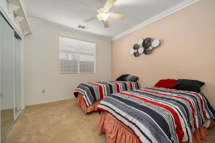 DON’T MISS THIS…Welcome to the lovely community of Shadow Ranch. This beautiful single-family home offers 2,913 square feet of living space. Boasting five spacious bedrooms including a private separate casita within the courtyard makes it ideal for those who love to entertain or simply enjoy ample living space. This cozy home features plantation shutters, plush carpet and easy-care ceramic floors- perfect for comfortable everyday living.Enjoy an expansive entertainers kitchen, complete with granite countertops, a functional center island, and ample storage. The formal dining room is perfect for entertaining.The primary ensuite is a true retreat, featuring a separate shower, tub, and double sinks, complemented by a spacious walk-in closet. Enjoy Southern exposure views from your private covered patio, overlooking the sparkling pool and spa–perfect for relaxing on sunny days. Additional amenities include a media/recreation room, powder room, coffered ceilings, crown molding and a secure gated entry.For golf lovers, the Lights of Indio Public Golf Course and Clubhouse are conveniently located just minutes away. Hit the hiking trails for a bit of fun and fitness..This partially furnished home is ready to welcome you. Don’t miss the opportunity to make it yours. Call today for your private showing