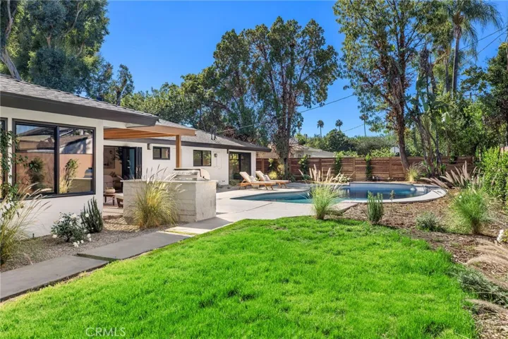 Welcome to this stunning single-level estate, tucked away on a private corner lot in Encino’s coveted Amestoy Estates. Recently and thoughtfully renovated, this home blends modern luxury with everyday comfort, offering an exceptional lifestyle in one of the Valley’s most sought-after neighborhoods. Step inside to an abundance of natural light and an open layout that immediately sets the tone. Expansive windows and bifold doors seamlessly connect the interiors to the outdoors, showcasing beautifully landscaped grounds, a resort-style pool, and inviting entertaining spaces—all while filling the home with warmth and light. The open-concept design effortlessly links the chef’s kitchen, living room, family room, and dining area, creating a functional flow that is ideal for gatherings and adapts seamlessly to both lively celebrations and quiet evenings. The spacious primary suite serves as a private retreat, with large sliders framing serene backyard views, a spa-inspired en-suite with dual vanities and a walk-in shower, and immense closet space. Four additional bedrooms provide flexibility for family, guests, or a home office. The backyard is a true California paradise, with a PebbleTec pool featuring cascading water features, multiple lounge and dining areas, a built-in BBQ, and a lush green lawn, creating an outdoor sanctuary designed for both unforgettable entertaining and everyday relaxation. Equally impressive, the front yard offers striking curb appeal with meticulously landscaped grounds and an expansive driveway that blends elegance, functionality, and a grand sense of arrival. All of this sits on over a quarter-acre flat lot, just minutes from the vibrant energy of Ventura Boulevard with premier dining, shopping, and entertainment. Here, style, comfort, and location come together—this is California living at its finest.