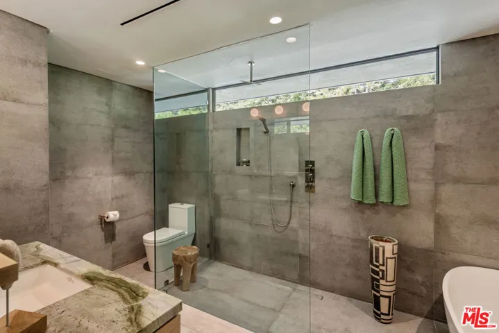 Recently rebuilt with intention and the highest level of craftsmanship, this reimagined mid-century retreat captures the rare balance between organic calm and architectural precision. The front grounds – composed by noted landscape architect Garett Carlson – frame the residence with lush, sculptural greenery and zen-inspired paths.Inside the secure gated entry, light moves fluidly across Venetian plaster walls, creating a tranquil rhythm throughout the residence. The formal living room serves as the centerpiece – anchored by a floor-to-ceiling bronze mirror fireplace and piano – where expansive glass panels open completely to the outdoors, merging home and landscape into one continuous environment. The kitchen is equal parts performance and display: new Miele appliances including built-in coffee, microwave, and concealed refrigerator/freezer, Wolf range and beautifully maintained stone counters. An adjacent glassware showcase and bar serve a second living area, also opening to the outside for seamless entertaining. The adjacent wine lounge adds a full modern bathroom and temperature-controlled refrigerator to the space, while a richly appointed powder room with a carved stone basin and dedicated laundry room complete the wing.Floor-to-ceiling sliders run the length of the main rooms, opening to an outdoor oasis designed for effortless gatherings: a large pool and spa set against lush California greenery, an alfresco kitchen and BBQ with generous dining deck, a separate seating area wrapped around a fire pit, and pockets of quiet landscape throughout. The primary suite extends directly to the hammock terrace and pool, and features a dramatic two-level, custom dressing room/closet, along with a spa-caliber bath appointed with rare Italian onyx dual vanities and a glass rainfall shower. A second bedroom enjoys its own bath with soaking tub and rainfall shower and opens to a private patio and fitness area. A third room – currently configured as the expansive primary closet offers flexibility for a future guest suite if desired.Every system was carefully renewed between 2020 and 2023, including new roofing, solar energy, and a high-efficiency HVAC with linear diffusers. Additional amenities include a sculptural metal slatted two-car garage with ample storage, and total privacy achieved by the enveloping landscape and design. The result is a refined indoor-outdoor retreat where art, light, and craftsmanship are the constant.