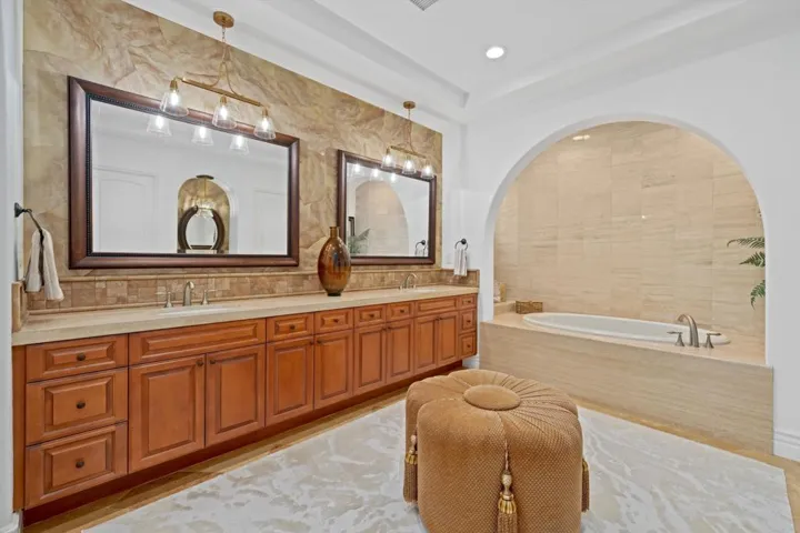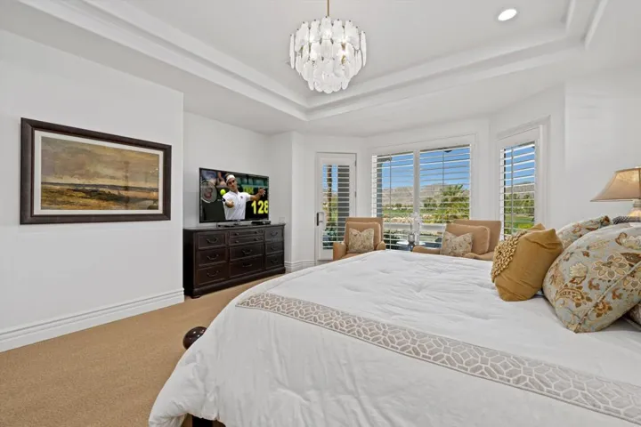 Enjoy all that Andalusia at Coral Mountain has to offer in this fabulous golf course home, perfectly situated on an elevated lot above the 8th fairway of the Rees Jones-designed course. Boasting breathtaking views of three fairways, a serene lake, and the majestic Santa Rosa and Coral Mountains, this residence offers a dramatic lifestyle with all the essentials for entertaining. The spacious open floor plan is offered furnished and features two expansive primary suites, each with luxurious, spa-like baths for ultimate relaxation. Guests will feel right at home in the detached two-room casita, complete with a cozy fireplace, private bedroom and bath, and a kitchen bar with a refrigerator and microwave. The great room is beautifully finished with custom built-ins, travertine flooring, shutters, electric solar shades, volume ceilings, and expansive glass doors that open to an incredible covered outdoor living area. The chef’s kitchen features a large center island, premium appliances, and a butler’s pantry. Step outside to your own private backyard paradise, where a sparkling pool and spa take center stage, complemented by a built-in BBQ island–all framed by unrivaled golf course and mountain views. Come live the life you’ve always imagined!