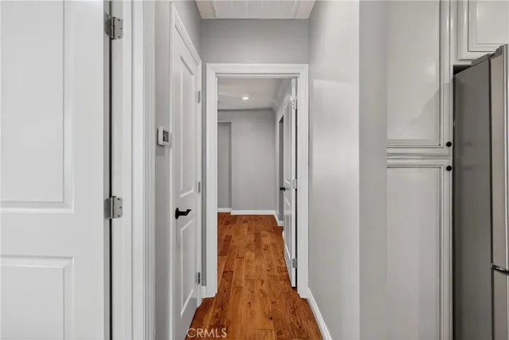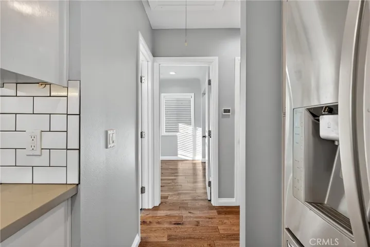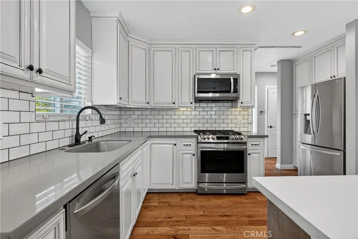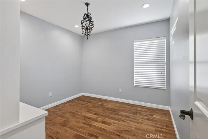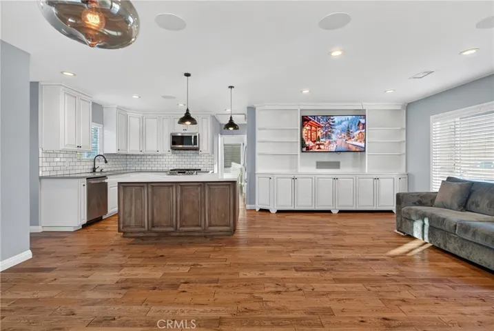 The kitchen is an entertainer’s dream with a spacious quartz island and breakfast bar, sleek white cabinetry, and stainless steel appliances. A walk-in pantry sits conveniently nearby, along with a laundry room for added charm and functionality.
