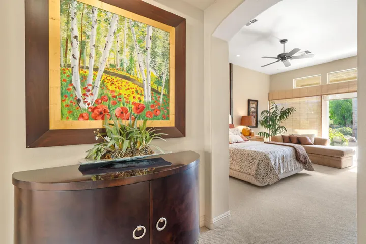 A beautiful home on a fabulous expansive south facing lot with endless views of the Santa Rosa Mountains, a lake, a waterfall and a private pool and spa. This rarely marketed Riviera floor plan offers 4 bedrooms (including a freestanding casita being used as an office) and 4.5 baths and 3 fireplaces. Enter the front courtyard through double, cut glass, doors and you are welcomed by a lovely water feature and a beautifully decorated home. The Riviera floor plan offers a formal living room, formal dining room, separate family room and an eat-in gourmet kitchen with island bar. This special home has upgraded finishes including granite counter tops, designer grade appliances, including an expanded primary bedroom suite closet to die for!. You will want to see this beautiful home in an outstanding Indian Wells location. Shown by appointment only.