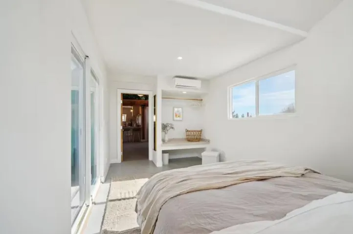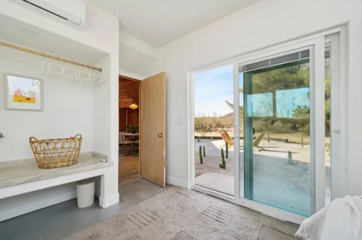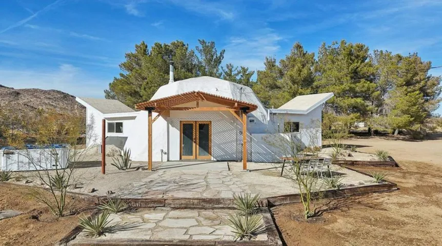 One-of-a-kind geodesic dome home that features designer touches enhancing the enchanting aesthetics. Built in 1975, this rare architectural gem features a spacious open floor plan with skylights, high ceilings, concrete floors, mini-split hvac, and a triple orb pendant lighting. Loft styled with curated Scandinavian botanicals and minimalist plant decor. Dining area is anchored with an oval chain swag light with ample room for many guests. Kitchen with breakfast bar, Taj Mahal quartzite counters, electric stove and cooktop, recessed lighting, tile backsplash, stainless steel dishwasher and refrigerator. Bathroom with vessel sink vanity, large walk-in shower with glass and raindrop shower-head. Two bedrooms with smooth white walls, dual alcove shelves and glass sliders leading to the patio. Fully fenced 2.5 acres with towering mature pinion pines enhancing the privacy and shade. Water well used primarily for agricultural purposes. Ample parking and a detached 700sf garage. Enjoy starry nights with friends under the milky way. Quad hammock star. Patio adorned with ”Mexican fencepost” cactus, Arizona Star agave and mature Joshua Trees. Shaded front patio. Hot tub with electrical sub panel. Sunken bench lounge area. Next to thousands of acres of government open space with hills and trails to explore. Not far from the Joshua Tree National Monument where about 3 million tourists visit annually. 12 miles to Yucca Valley for all amenities. 44 miles to Palm Springs. 132 miles to Los Angeles. Don’t Wait! – Call Now!