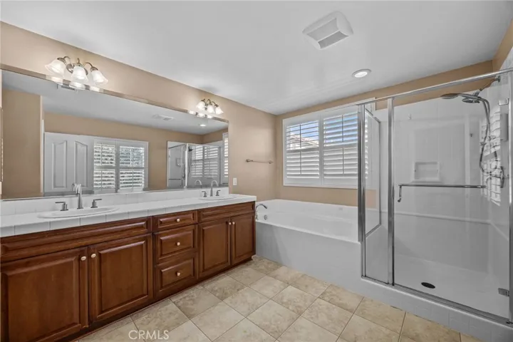 The floor plan features a downstairs bedroom and full bath—perfect for guests or multi-generational living. Upstairs, a versatile loft with built-in office space complements the well-sized bedrooms, and the primary suite offers a spa-like retreat with dual vanities, soaking tub, and a spacious walk-in closet.